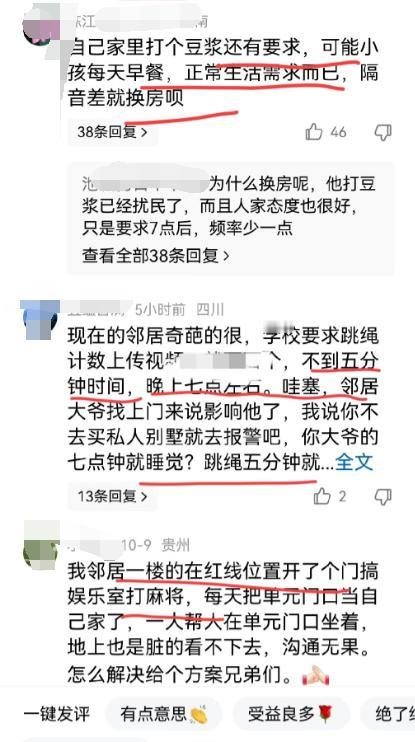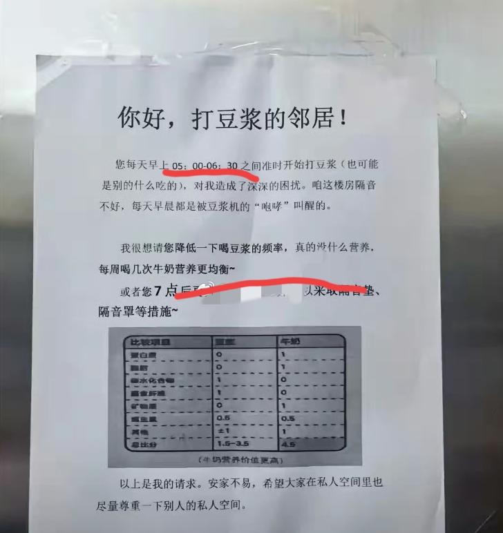 不是,现在扰民都这么理直气壮了? 打豆浆要5点到6点半,这个点正是别人最需要休息的时候,现在你不用隔音垫、隔音罩之类的想办法减弱噪音,也不肯推迟打豆浆的时间,合着全小区的人都得陪你早起啊? 不打扰别人是最低的素质要求,可惜现在的中国人没有最低,只有更低。缺德没素质人群越来越多,一个个不考虑邻居生活感受,只顾自己肆无忌惮! 豆浆机的声音,不但是声音还有就是振动,俩者一起传播是真的难受,单在外面罩个东西作用不大,要在底座下面放一块胶垫或是厚点的抹布,抹布一定要放平,外面再罩个罩子。 破壁机豆浆机确实有点缺德,这玩意能让楼上楼下好几家人睡不着,发明的什么玩意,就不能给改进一下吗?