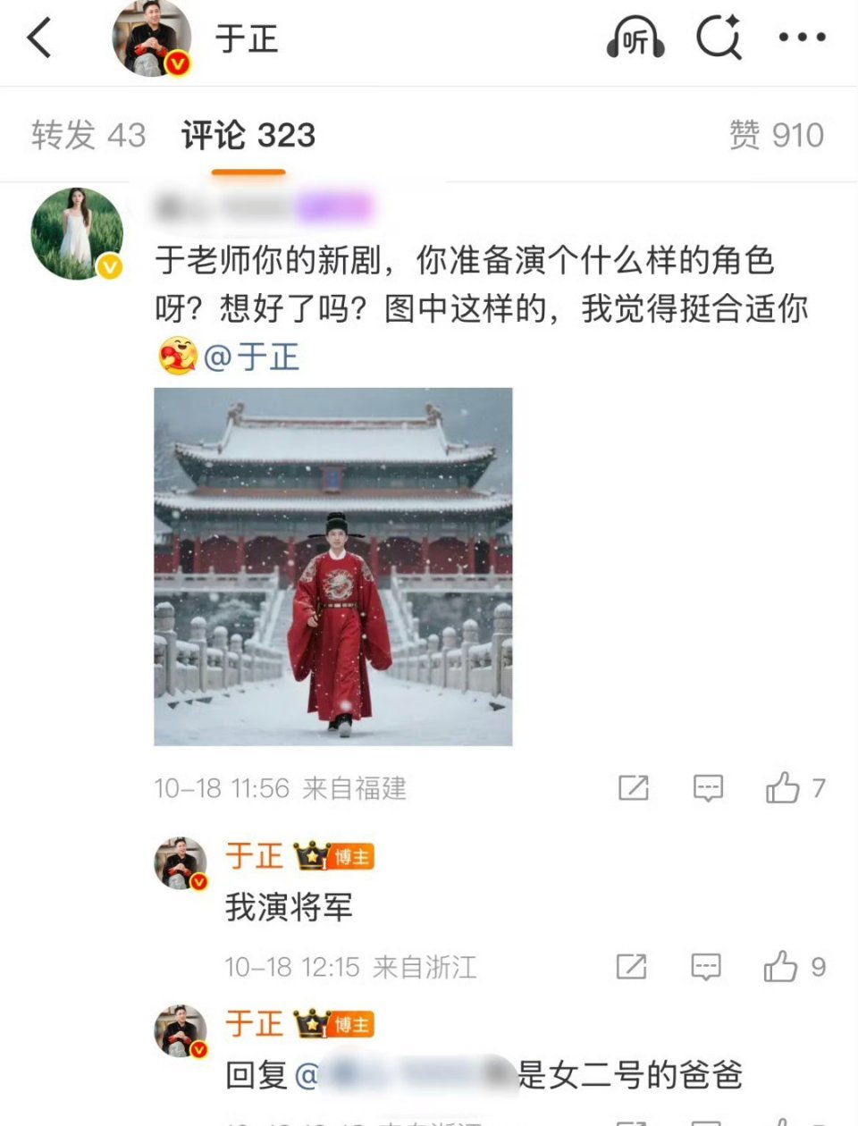 于正说将在新剧里饰演一位将军,是女二号的爸爸,看看是不是真的[笑cry]