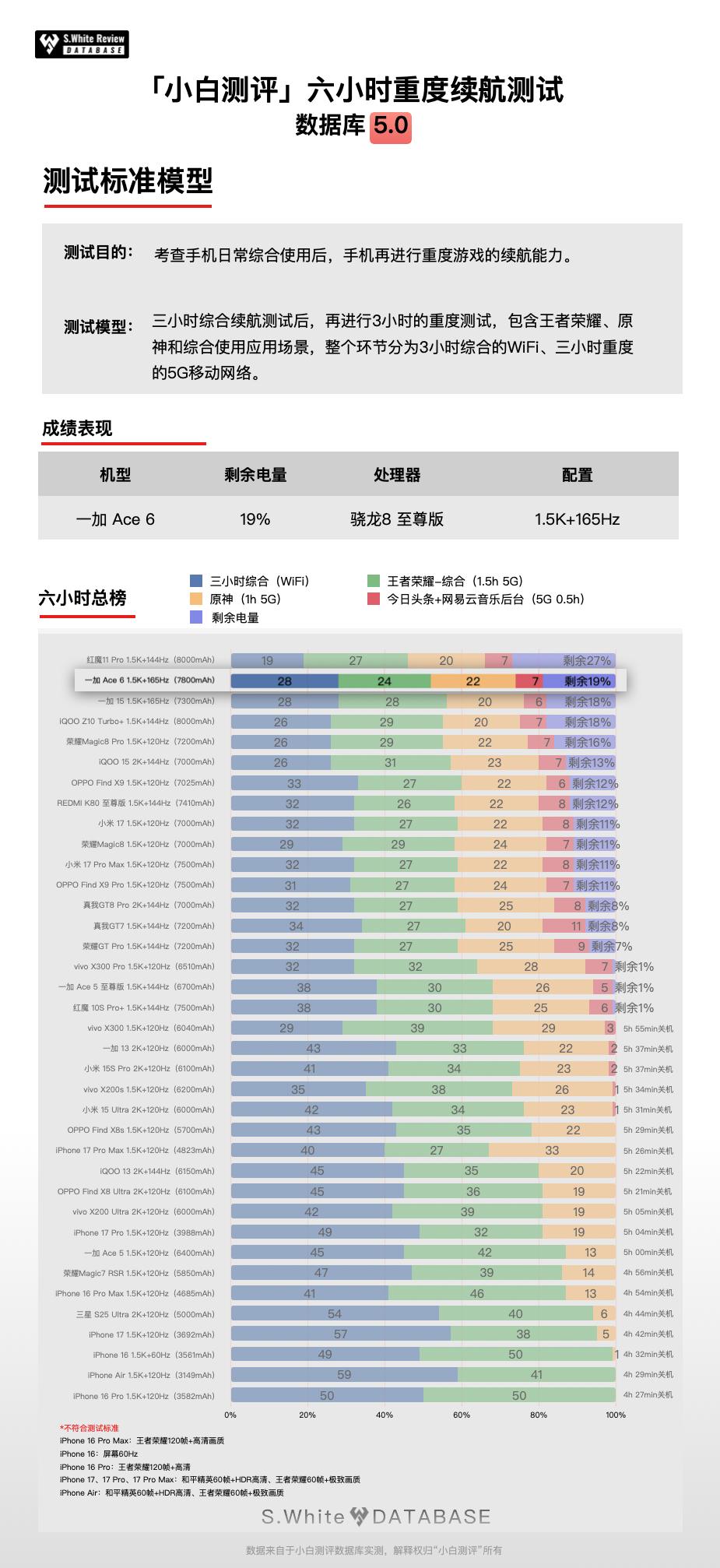 7800mAh电池的一加 Ace 6,同时还配备120W的充电,这两组合肯定是它一大重点,数据库5.0模型,实测续航和充电表现如下:
