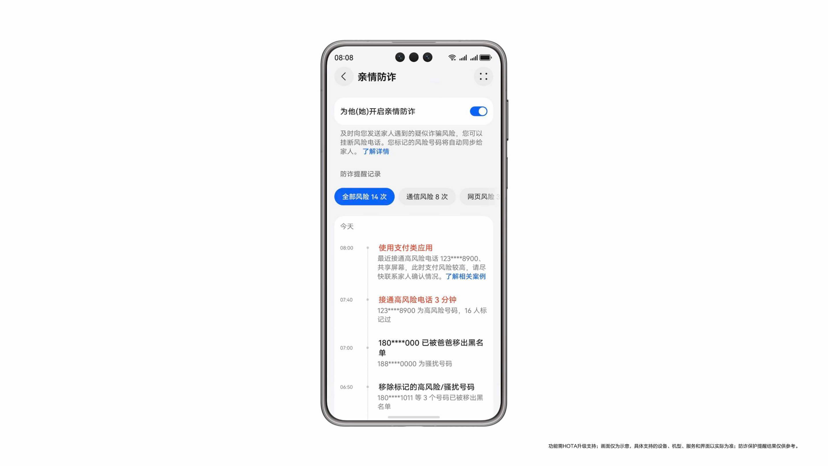 鸿蒙6的星盾安全功能又升级了,新加入的AI防诈还能保护家人。比如鸿蒙6帮父母挂断诈骗电话 后,还能把这个诈骗电话加到“家庭黑名单”里,挡住风险,让用户既安全又省心