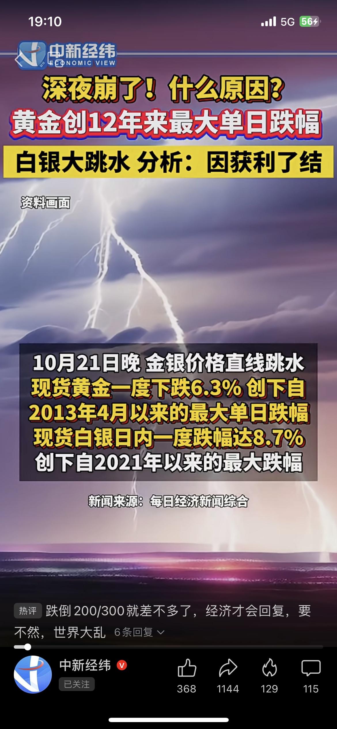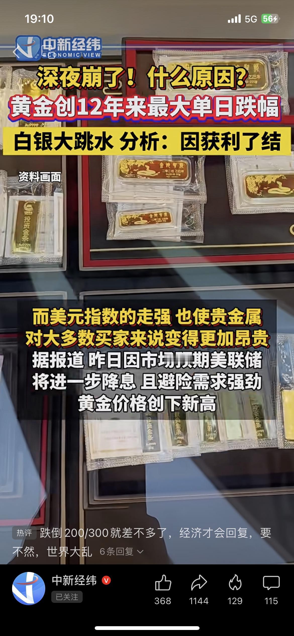《黄金创12年最大暴跌!暴跌原因找到了,这底到底能不能抄?》 昨晚黄金“崩了”