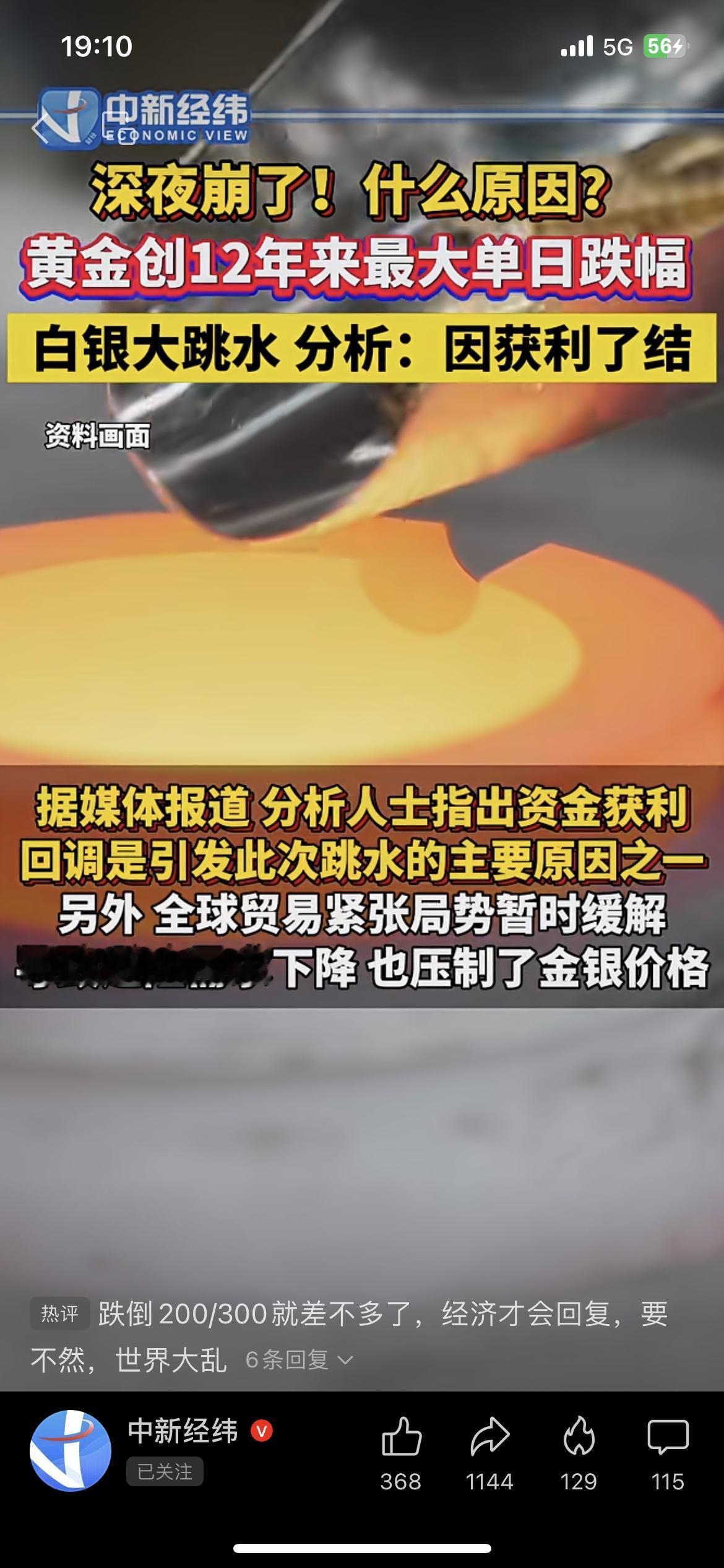 《黄金创12年最大暴跌!暴跌原因找到了,这底到底能不能抄?》 昨晚黄金“崩了”的消息,是不是把你吓一哆嗦?现货黄金暴跌超6%(12年来最大单日跌),白银更狠跌了8.7%,直接成了“贵金属跳水大赛”! 为啥跌这么疯?核心原因就3个:①之前涨太猛,资金集体“获利跑路”;②全球贸易紧张劲松了,没人抢着买黄金避险;③美元走强,买黄金变贵了… 前几天还抢着囤黄金的人,现在有人哭晕在厕所,有人硬着头皮抄底——但这“底”到底是坑还是机会? 你觉得这波黄金是短暂回调,还是真的“凉了”?敢不敢下手抄底?来评论区唠唠!