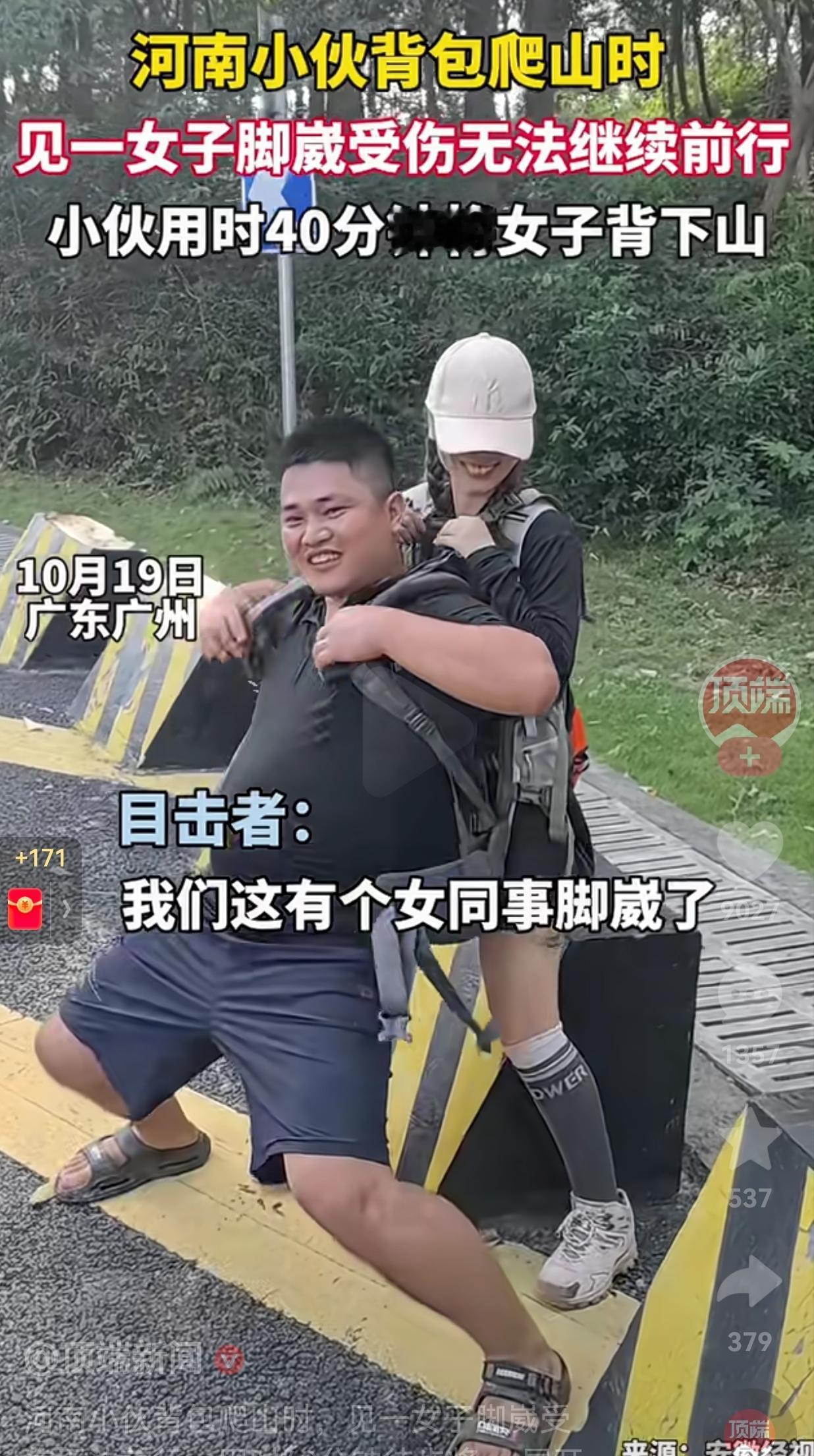 河南小伙太棒了!河南一小伙在广东广州背包爬山时,见到一名女子脚崴了,无法继续向前