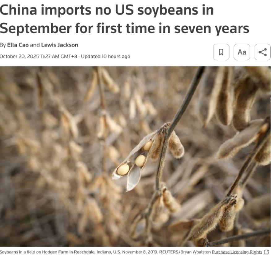 英媒发现,中国,7年来首次。 据路透社10月20日报道,中国在2025年9月未从美国进口任何大豆,这是自2018年11月以来,近7年来首次出现零进口的情况。相比之下,南美的大豆出货量较去年同期激增。 中国不买美国大豆这事儿,最直接的原因就是美国自己作的——加税导致价格账划不来。2025年,美国又升级了贸易关税,把大豆相关的税费一叠加,总税率飙到了34%。可南美那边呢?巴西大豆关税才3%,阿根廷还主动降到了2.6%,一升一降差出一大截。 就拿一吨大豆来说,美国货的到岸价比巴西货贵240多块,咱们国内的油厂、饲料厂都是做生意的,哪能做亏本买卖?谁便宜质量又不差,自然就买谁的。 而且这不是第一次吃关税的亏了。2018年贸易战刚开始,美国就拿大豆当筹码,咱们当时就开始往南美转,这十几年早把供应链铺好了。以前美国大豆还能占中国进口的半壁江山,到2024年就只剩20%了,今年9月干脆归零,算是把多年的布局落到了实处。 再说咱们自己的大豆产量虽然涨了,2024年收了2065万吨,可一年要消费1亿多万吨,缺口还得靠进口补,但补缺口的渠道早不止美国一条了。 大洋彼岸的美国大豆农场,现在真是惨。明尼苏达州有个第四代农民,家里仓库堆得满满当当,新豆子马上要收割,旧的还没卖出去,贷款利息都快付不起了。爱荷华州更惨,已经开始出现破产潮,当地豆农协会算过,从2018年到现在,光对华出口就跌了一半多,损失26亿美元。 之前政府还发过230亿美元补贴,可钱到手也换不回市场,现在豆农们联名写信喊“要市场不要补贴”,心里都清楚补贴是救急不救穷。 更要命的是,没了中国这个大客户,美国大豆根本找不到下家。墨西哥全年才买几百万吨,印度的需求连零头都不够,非洲市场也消化不了多少。 有行业大佬直言,中国是全球最大的大豆买家,根本没有任何市场能替代。要是11月前还拿不到订单,美国今年得损失1400万到1600万吨的生意,相当于全年出口量的四分之一。有些仓库堆得太满,甚至发生了粮仓坍塌的意外,看着都揪心。 这边美国农场冷清,南美那边的港口却忙得脚不沾地。青岛港的工人最有感触,以前每月还能看见几艘美国粮船,现在满眼都是巴西、阿根廷的旗帜,平均一天要卸3船大豆。 9月巴西对华出口了1096万吨,比去年涨了近30%,占了咱们进口的85%还多;阿根廷更厉害,出口量翻了快一倍,两国加起来占了94%的份额。咱们当月总进口量不但没降,还涨到了1286.9万吨,创下同期第二高,根本没受美国断供的影响。 南美国家这几年也跟着咱们的需求在使劲。巴西、阿根廷都在加大投资修仓库、建铁路,就是为了更快把大豆运到港口装船。中国企业还去当地建了联合种植基地,从选种到收割都参与,既能保证大豆质量,供应也更稳定。以前南美大豆运到中国得等挺久,现在物流效率提上来了,基本能跟上咱们的需求节奏。 这些变化不光让南美农民赚了钱,当地经济也活了。巴西的大豆出口商添了新船,阿根廷的港口工人涨了工资,连周边的餐馆、商店生意都好了不少。两国还跟中国商量用本币结算,不用再换美元,省了不少手续费,合作起来更方便。有南美官员说,以前靠美国市场时,价格老被压得很低,现在跟中国合作,既能卖上价,还能稳定出货,心里踏实多了。 可能有人会问,南美大豆会不会趁机涨价?其实咱们早有准备。虽然巴西大豆因为需求大,价格涨了一点,但国家储备库里还有存货,能先顶一阵,等明年初巴西新豆子上市,价格自然会降下来。而且咱们还在开拓俄罗斯、埃塞俄比亚这些新供应源,以后选择更多,根本不怕被谁卡脖子。 说到底,9月的零进口不是突然翻脸,是多年布局和市场选择的结果。美国非要用关税当武器,把自己的大豆挤出中国市场,最后吃亏的还是自己的农民。而南美抓住机会把生意做好,也是双赢的结果。这事儿说白了就是:做生意得讲规矩,谁靠谱、谁划算,大家就跟谁合作,霸权那套在粮食贸易里根本行不通。