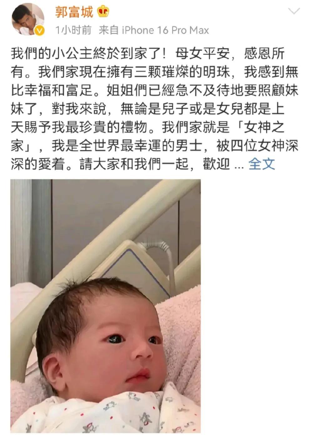 郭富城又喜得千金,现在三个女儿了! 郭富城看起来很开心,在小女儿一出生,他就立