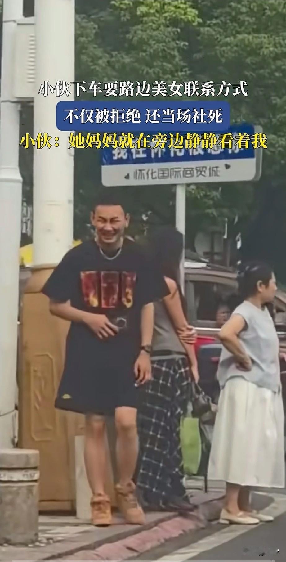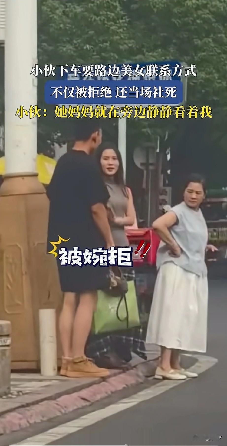 怀化效果真的太勇敢了, 路过当地商贸城看到长发美女, 犹豫半天还是决定勇敢一次, 下车直奔长发美女走去, 勇敢上前搭讪, 向美女索要微信, 没想到旁边大妈就是美女的母亲, 大妈转身对着小伙从上瞅到下, 表情异常严肃, 看来是对效果不满意, 美女三言两语就婉拒了小伙, 美女确实挺会打扮, 看来很不错, 她母亲一脸难以相处的感觉。 可能觉得小伙子不是正经人, 也怪小伙子穿搭太随意, 脖子上还挂着白色项链, 小伙被拒绝后, 很是尴尬, 只能带着尬笑走向车里, 车上等待的小伙们笑的合不拢嘴, 有可能是妈妈或者婆婆在身边不好意思,不是说男人不坏女人不爱吗? 看小伙子具备了坏男人的潜质了, 大家觉得街头美女为何会拒绝小伙子要微信? 一起聊聊爱情 爱情究竟是什么样子的 如果你被陌生人搭讪要微信你给不给 搭讪新方式? 怀化风景 怀化街景