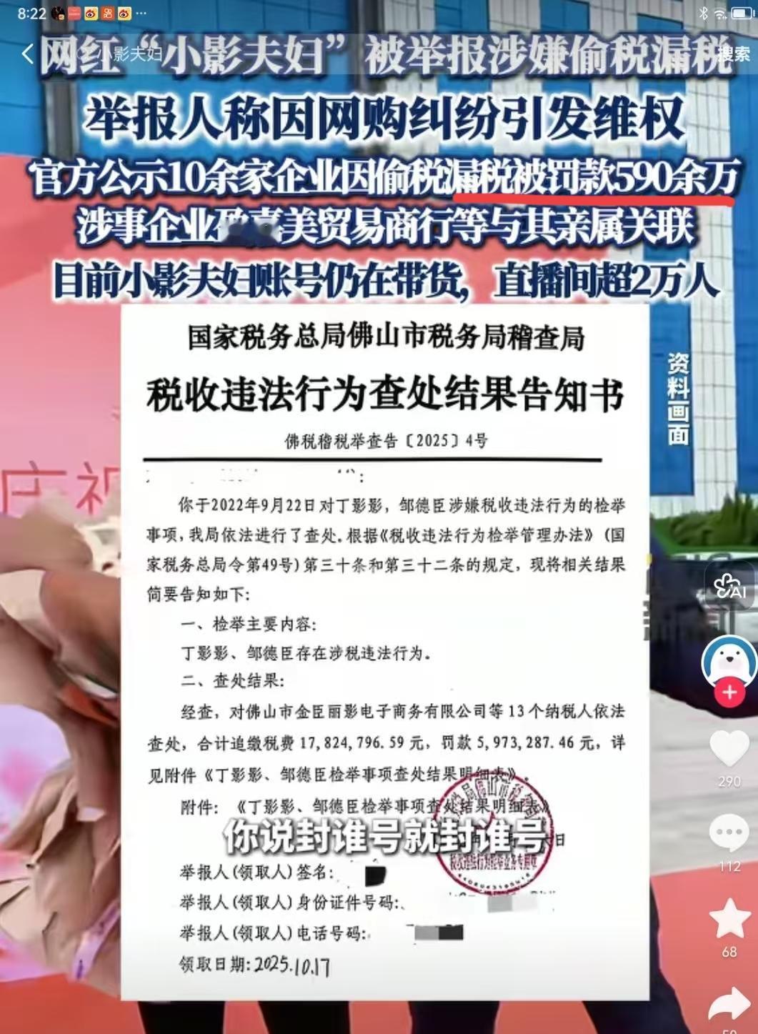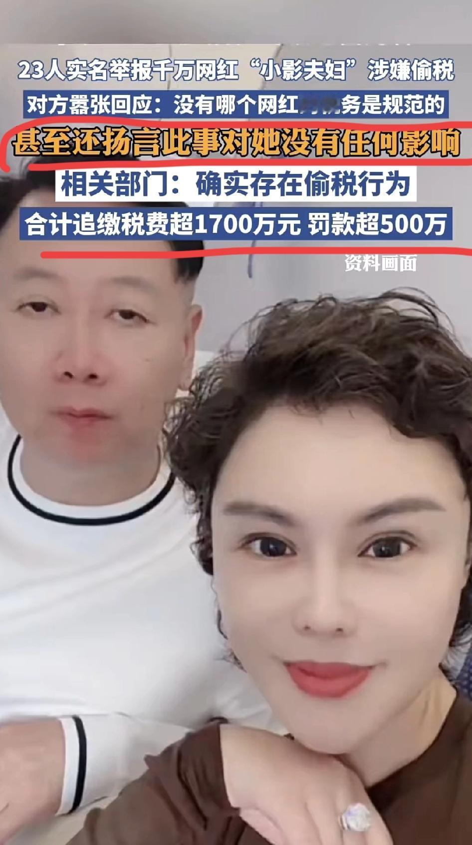 千万网红“小影夫妇”真沉得住气啊,晚上8点多看还在直播。 在网上看到对他们的税务处罚,要追缴1000多万的税费,还有近600万的罚款。 该低头就得低头啊!“天狂有雨,人狂有祸”,老话在理。 偷税是一方面,说话也是实在嚣张,完全没有认错态度。 小影和她老公各自都有三婚,三个孩子三个爹。 她自述未成年就生了大儿子澳国,但头婚很短,孩子在爷奶家长大。 后来儿子来找她,小影先花30多万给买辆车,又全款100多万买了房,今年9月底刚给澳国办了一场风风光光的婚礼。 能看出做直播的确赚钱,可以后还能愉快地带货吗?