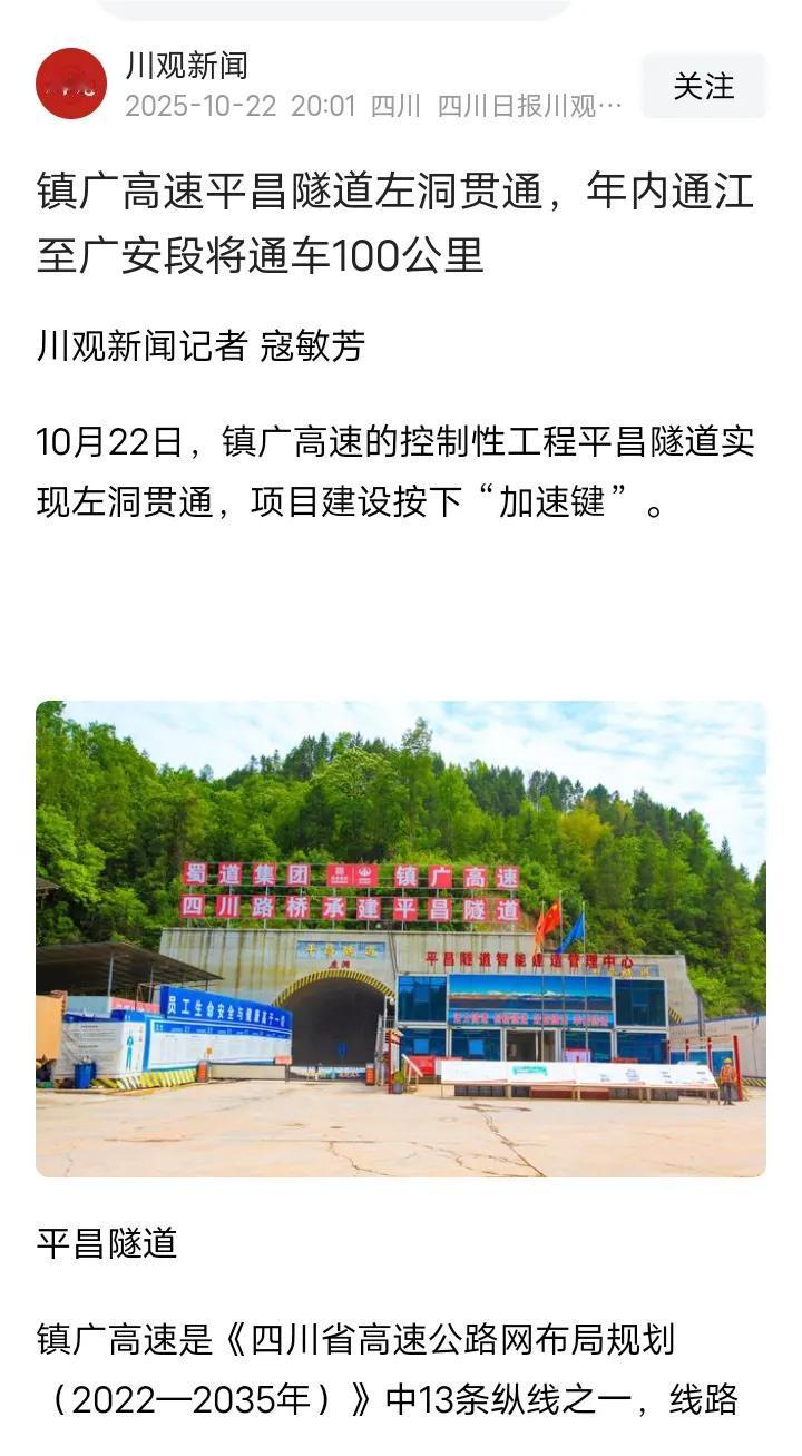 好消息,巴中通江至广安的S15通广高速控制性工程全长约5.6公里的平昌隧道左洞顺