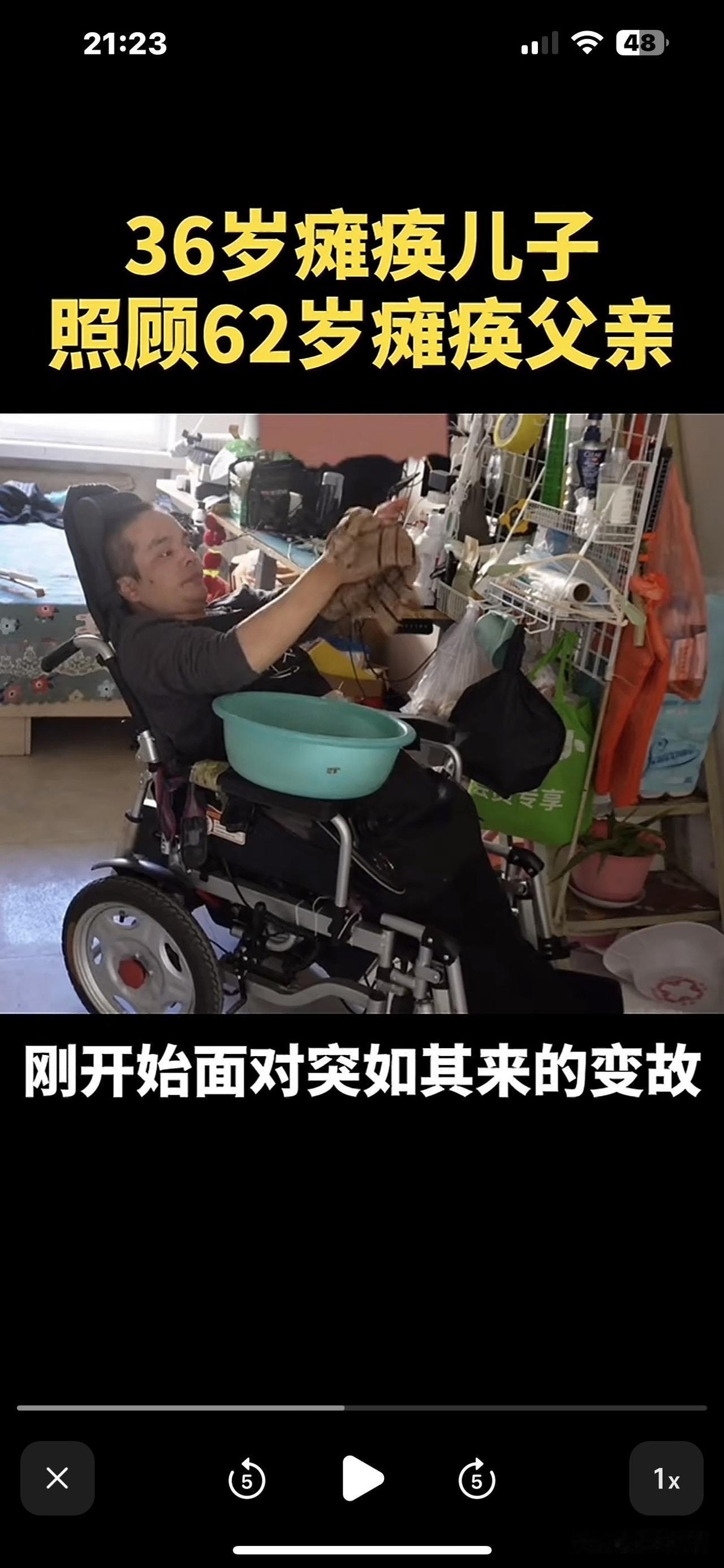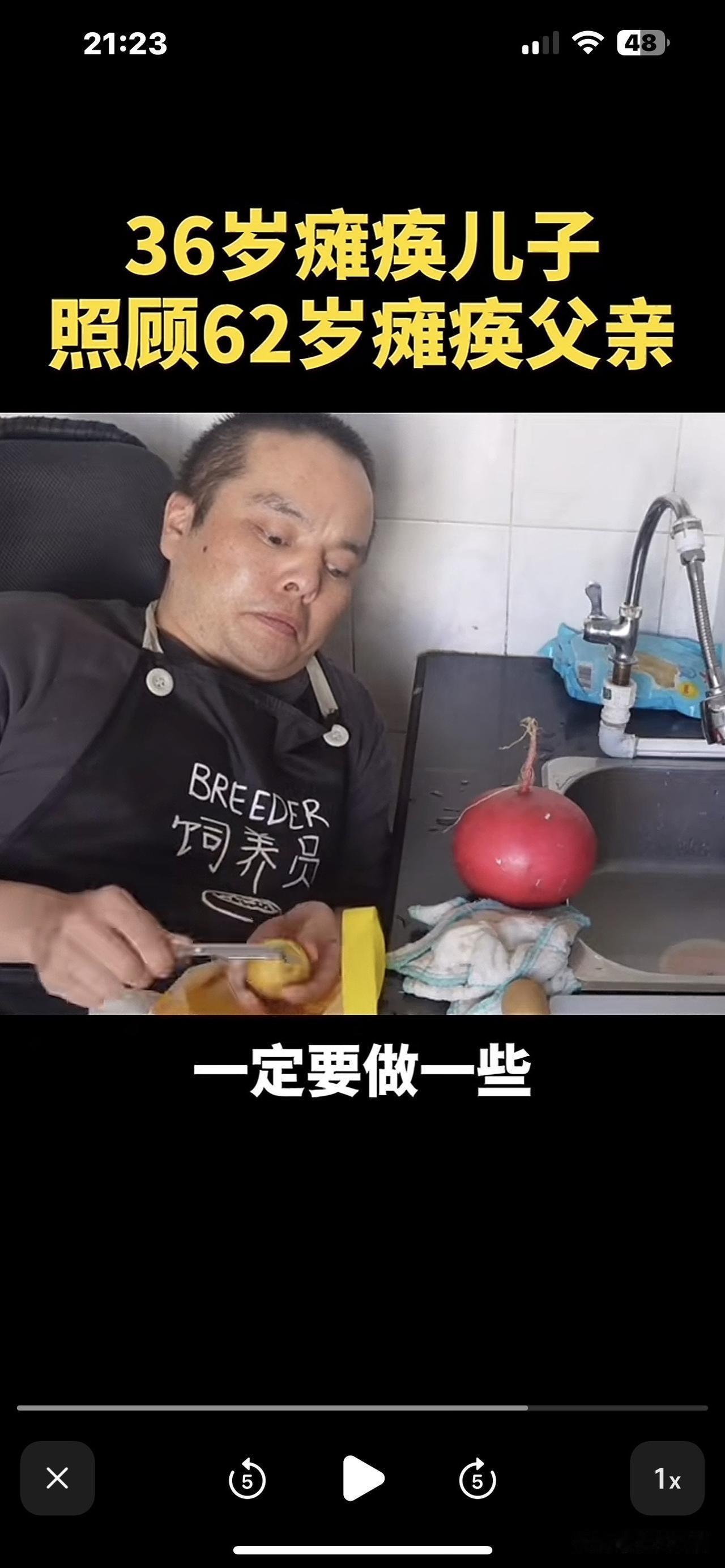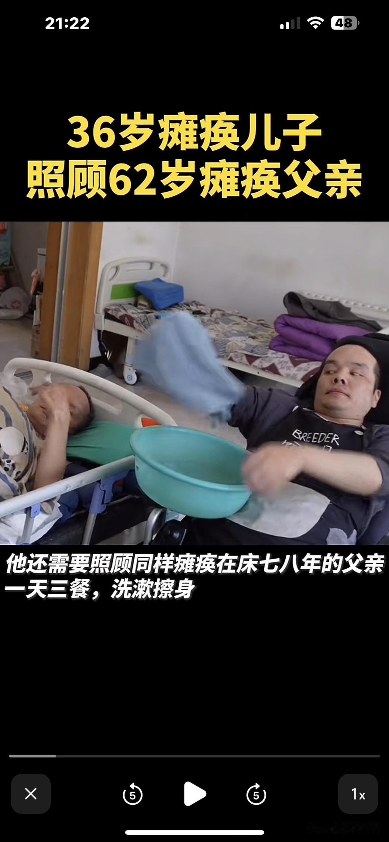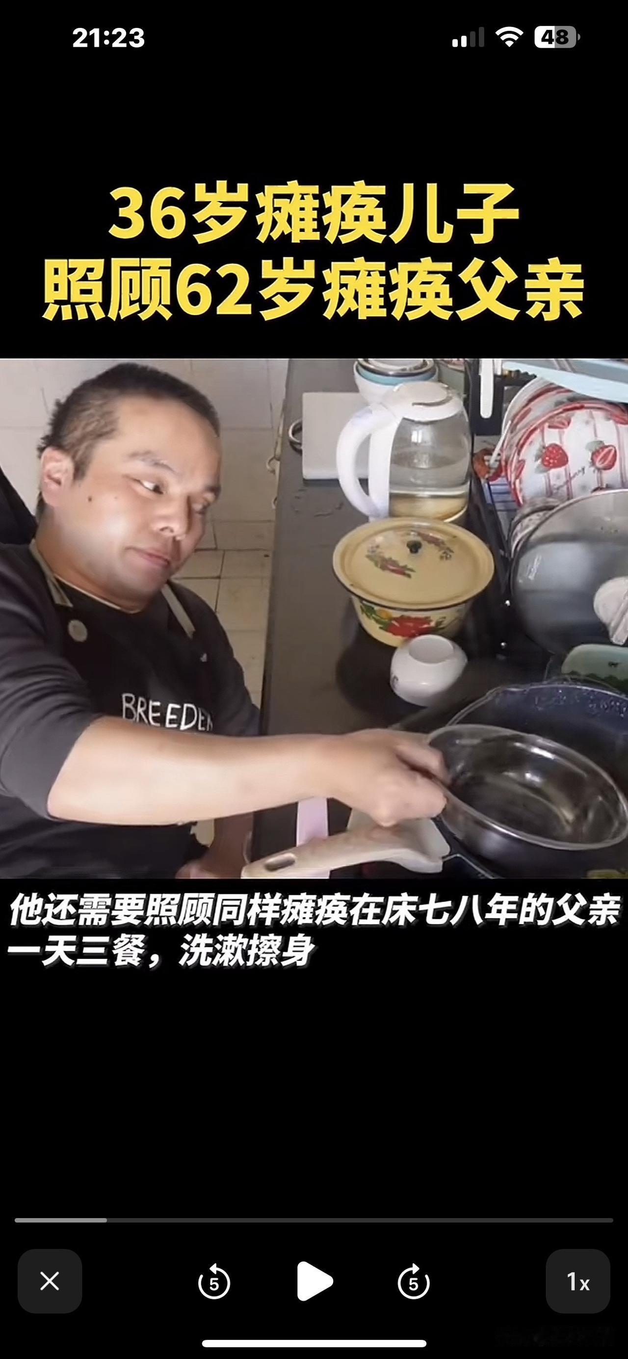 看完他们的故事还有什么理由抱怨生活。 这是被央视点名的感人真实故事。36岁瘫痪儿子照顾62岁瘫痪父亲,整整15年,两个瘫痪的人相依为命。不少网友感叹,这样的人都在坚强活着,自己还有什么理由抱怨生活。 他叫张晓东,家住黑龙江省佳木斯市。十几年前他还是一个强壮的帅小伙,然而在他24岁那年,他的全身开始僵硬,动不了,去医院一查竟被确诊为强直性脊柱炎。家里没钱给他治病,连寿衣都买好了。没曾想母亲先他一步走了,得了卵巢癌,不幸去世。祸不单行,三个月后父亲也因突发脑溢血,半身瘫痪,再也说不了话。一夜之间这个家彻底垮了。 为了照顾父亲,张晓东决定自力更生,用仅能动的双手撑起这个家。每天早上5点起床,他先叠好被子,再用双臂将腿部挪到床边,用晾衣杆穿上裤子和鞋子,接着坐上轮椅,打来水为父亲洗漱擦身。父亲常常会突然泪流满面,也能感受出来他也是不想这样,也不想拖累我,没有办法,因为他知道我也行动不便。 做完这些已经日上三竿,张晓东赶紧去切菜做饭。别看他身体行动受限,视力模糊,厨艺却是十分了得。做饭唯一不方便就是看不见,就只能凭感觉去切,因为眼睛看不到那个刀的另一侧。 更厉害的是,为了生活,张晓东还开始自学短视频直播,在轮椅上练习高难度动作。渐渐地他不光能出门买菜,倒垃圾,还能给自己理发,给爸爸洗澡。虽然自己过得不尽人意,他却见不得这人间疾苦,给自己找了两位合租室友。 他收留了一位智力障碍人士,喊他舅舅。舅舅因为小时候发烧成了脑瘫,没法照顾自己,张晓东就给他搭了一个床铺,提供一日三餐。每天上午舅舅都会出门溜达,到了饭点就准时坐在桌旁等着开饭。而另一个室友是一只小猫,买菜时看到快饿死的流浪猫,他就带回家养着,给他起名汤圆。 或许是上天不会辜负每个善良的人。2021年,张晓东在新闻上,看到人工关节从几十万元降到了几千块,他一下子燃起了希望,开始攒钱做手术。就在这时,成都市第三人民医院的梁益建医生决定为他免费治疗。 现在很多四肢健全,身体好的在啃老,但是他不是,所以很多人深受感动。刚被好心人送到成都,送进病房,梁益建医生就塞给了他两万块钱。 经过两次手术和4个月的康复训练,瘫痪了14年的张晓东终于站起来了,他开始重新学走路,从今往后就能站着照顾爸爸了。命运打倒了张晓东的躯体,却没能击倒他的意志,即使他身处泥潭,却依然开出了花。愿每一个身处逆境的人,都能始终坚持信念,向阳而生。