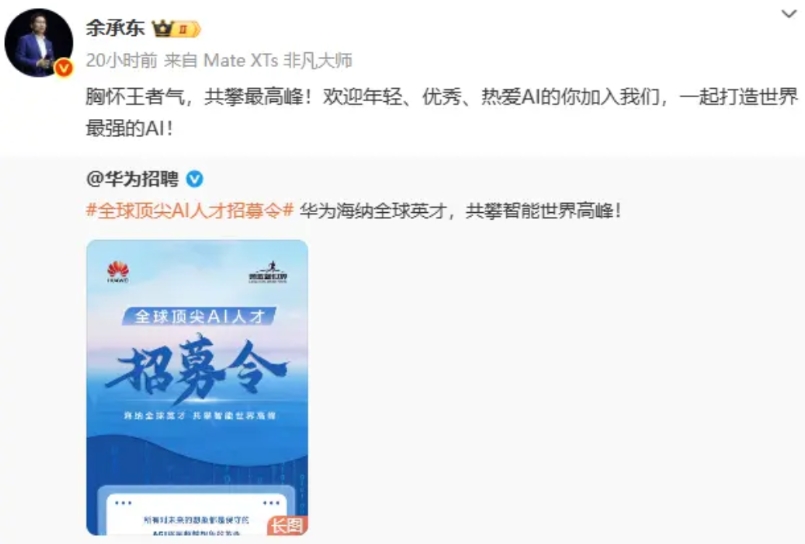 10月20日,余承东在微博上发了一条全球顶尖AI人才招募令,海纳全球英才,打造世界最强AI。