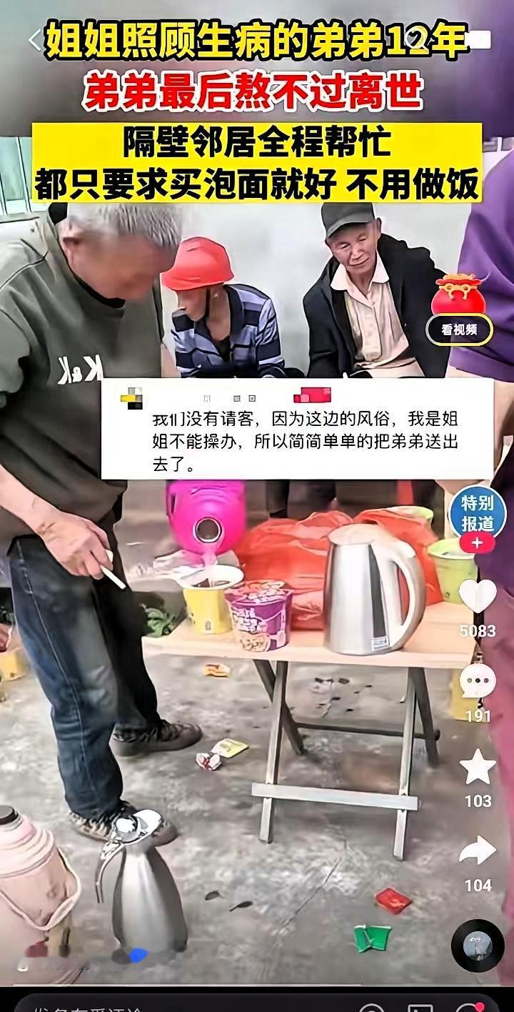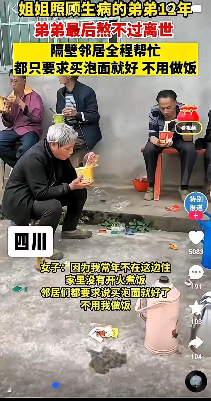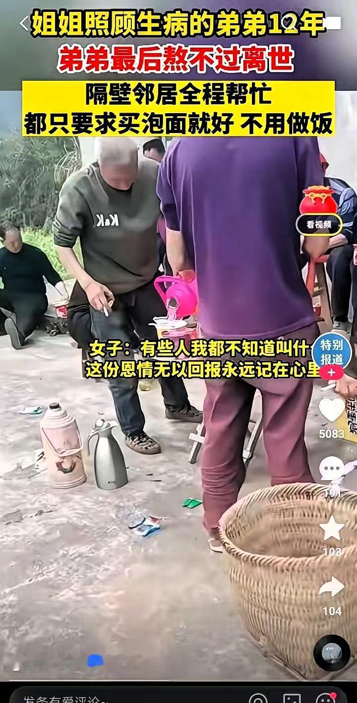 催人泪下的一幕!四川小丽(化名)这12年熬得太苦,可乡亲们一碗泡面的善意,却让全网感受到了最戳心的人间温暖! 从小没了爹娘,她和弟弟相依为命,刚结婚两年,娘家弟弟就查出癌症。没有丝毫犹豫,她撇下小家搬回娘家,一守就是12年。每天端汤喂药、擦身翻身,四处借钱求医,把家里积蓄掏得一干二净,自己熬得眼窝深陷、头发添了不少白丝,终究还是没能留住弟弟。 处理后事那天,小丽强撑着悲痛,刚要进厨房张罗饭菜,就被涌来的村民死死按住了手。“别忙了!”大家异口同声,语气里满是心疼,“泡碗面就行,我们自己动手搭棚子、收拾东西,不用你操心!” 没有复杂的客套,没有多余的讲究,乡亲们心里都清楚,这个女人12年早已熬干了力气,不能再让她在最痛的时刻,还要强撑着为别人操劳。他们默默忙活,一碗热泡面就解决了吃饭问题,没人提要求,没人添麻烦。 都说现在人情淡薄、邻里疏远,可这一刻的温暖却狠狠打脸——真正的善意从不是轰轰烈烈的捐助,而是这种“懂你难处,悄悄替你减负”的默契。12年的坚守是小丽的深情,一碗泡面的包容是乡亲们的温柔。