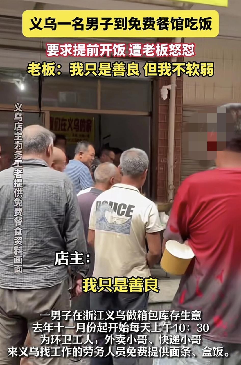 浙江义乌一南子进入一家免费餐馆吃饭时,看着时间觉得自己肚子饿了,就催促老板赶紧炒菜,没想到老板霸气回应说他们虽然是免费的场馆,但是他不是弱者,说好的10:00开饭,如果还没来得及,等不了就不要等了。网友们纷纷支持老板的做法,免费场馆并不代表别人可以随时来这里发号司令。要懂得感恩,免费的东西不是哪里都有,既然老板大发慈悲,我们也要给多一点的耐心。
