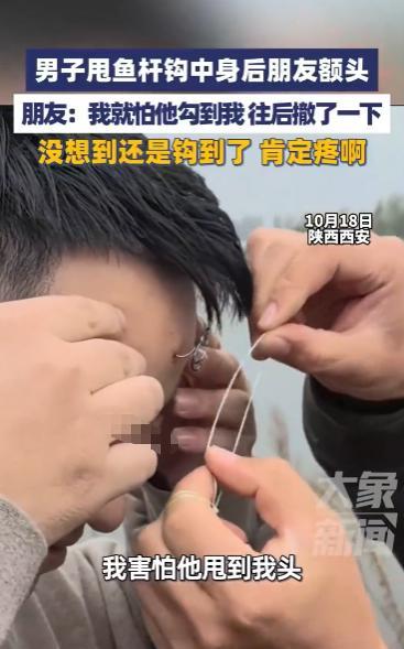 “太尴尬了!”10月18日,陕西西安,一男子钓鱼展示技术甩鱼竿,结果鱼钩飞出正中一旁朋友的眉心,钩子深深勾住朋友额头的肉,让人看着都疼!网友:这是钓了条“美男鱼”吗? 不少钓友在野钓时喜欢甩杆,甩竿能把鱼饵精准投到钓点,避免抛偏,野钓时还能少浪费窝料、聚鱼,可甩杆前一定要提醒身边人离得远点。 一男子钓鱼时为给朋友展示技术甩杆抛钩,站在一旁的朋友看着有些发怵,怕鱼钩勾到自己,特意往后撤了一步,走到一个自认为比较安全的位置。 越怕什么就越来什么,在男子甩杆的过程中,鱼钩直直往朋友的眉心飞去,深深扎进了他的额头,看起来十分骇人,朋友直接疼得叫了出来。 男子见状赶忙上前道歉,随后用鱼线绕过鱼钩,一手按着朋友的额头,一手拉着鱼线快速将鱼钩从朋友的头皮中带了出来。 可怜的朋友额头留下了一个圆形的伤疤,隐隐发红,他哭笑着表示,以后别人甩杆时,千万不要站在旁边,不然就会跟他一个下场。 不少网友表示,光是看着就已经感觉到疼,有人调侃男子技术没展示成,反而钓了条“美男鱼”,不管怎么说,钓友们甩杆前可千万要提醒身边人离得远点! 信息来源:《男子甩鱼杆钩中身后朋友额头,朋友:我就怕他勾到我》大象新闻