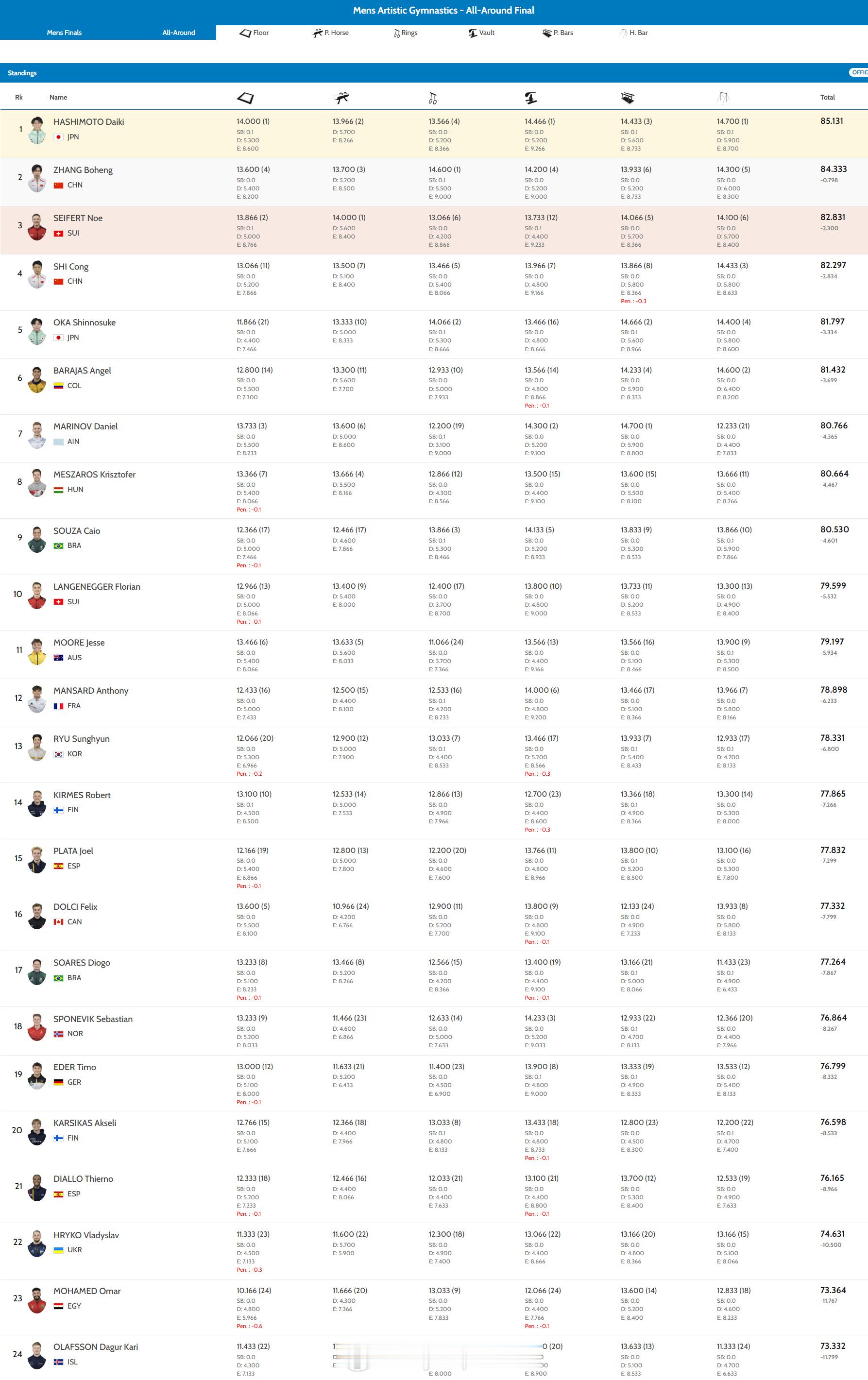 【体操世锦赛桥本大辉个人全能三连冠 张博恒摘银】张博恒世锦赛全能亚军2025体操世锦赛 10月22日雅加达,体操世锦赛结束男子个人全能决赛。日本名将桥本大辉发挥稳定,以85.131分实现三连冠。中国选手张博恒在双杠项目出现小失误,以84.333分(自由操13.600、鞍马13.700、吊环14.600、跳马14.200、双杠13.933、单杠14.300)。资格赛排名第二的瑞士选手塞菲尔特摘得铜牌。另外一位中国选手侍聪排名第四,成绩为82.297分。2025年体操世锦赛