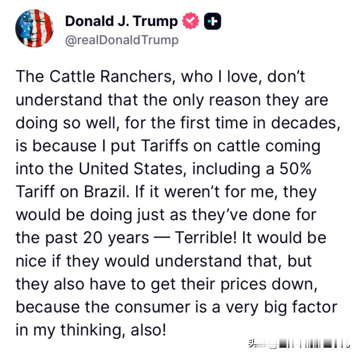 特朗普表示,美国的牧场主他们几十年来第一次如此成功!主要原因就说对巴西征收50%的关税!10月23,凌晨看点, 据特朗普发文表示,我所热爱的牧场主们不明白,他们几十年来第一次如此成功的唯一原因是我对输往美国的牛征收关税,其中包括对巴西征收50%的关税。如果不是我,他们的处境会和过去20年一样——糟透了!如果他们能理解这一点就好了,但他们也必须降低价格,因为在我看来,消费者也是一个非常重要的因素! 而巴西总统卢拉发文表示,我们已抵达印度尼西亚雅加达。明天我们将开启东南亚的一系列行程,包括对印度尼西亚进行国事访问、出席在马来西亚举行的东盟和东亚峰会,以及与巴西和亚洲商界领袖的会晤。 昨天,我们宣布将在日、新加、韩、埃和印为巴西产品开辟新市场。自2023年初以来,我们已开辟了460个新市场。 综合来看(个人观点),美国的牛肉价格上涨,这也成为了特朗普吹捧的事情?事情真的是特朗普所说的这样吗,我看到有美国的网友说是美国的旱灾导致美国畜牧数量到达了最低点。原来这就是对美国牧场主的利好。而且还给阿根廷进行400亿美元的援助,还要购买大量的阿根廷牛肉。原来美国的利好是这样,靠自然灾害利好。 对于以上事件你有什么看法,欢迎评论区留言探讨,你怎么看呢?关注我,获取更多国际精彩资讯!