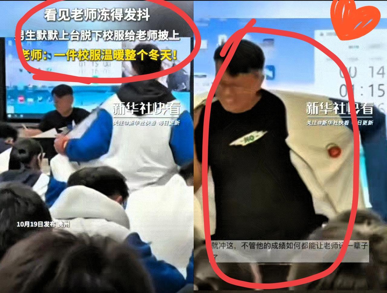 这一刻成绩已经不重要了!降温天老师穿短袖坐讲台自习,冻得微微发抖硬没吭声,后排男生一眼就看出来了!原以为是 要问问题,没想到他直接脱了校服外套走上前,一句“老师,我的校服借你”,不等拒绝就披在了老师身上。 老师那瞬间的笑容,从惊讶到感动藏都藏不住,全场掌声响起来的时候,真的比任何奖状都让人觉得温暖。 别总说现在的孩子不懂事,他们的共情力其实比谁都纯粹——教育从来不是只教公式定理,而是教孩子怎么把温柔藏在细节里。 这个男生的举动,比任何说教都管用,这才是最生动的“做人课”啊! 你们上学时有没有过让老师超感动的瞬间?来聊聊~