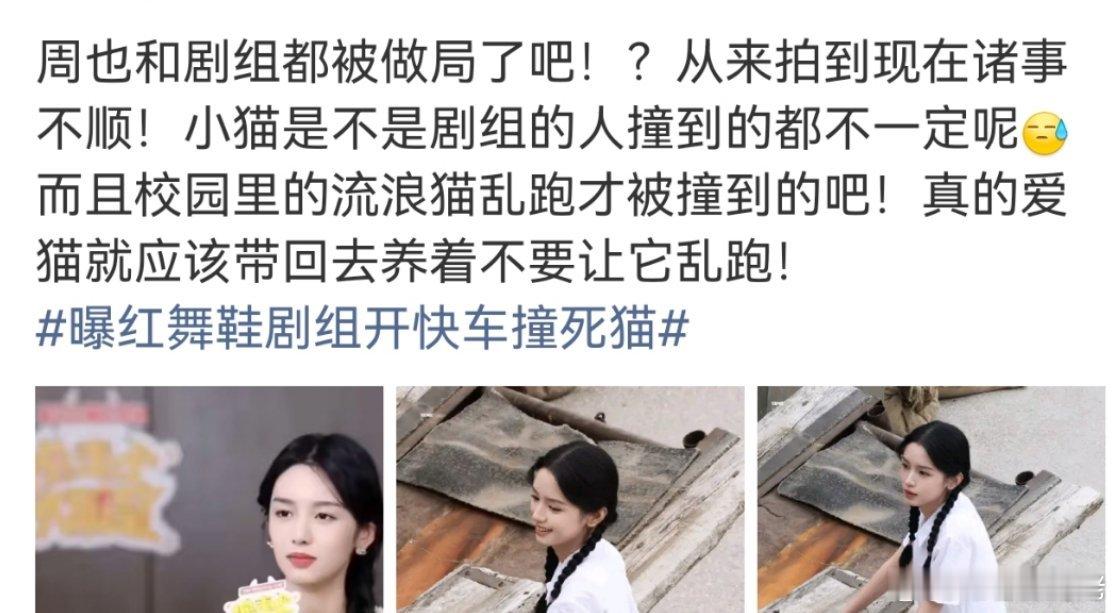曝红舞鞋剧组开快车撞死猫 点开这个热搜吓一跳,热搜广场的周也和王子奇粉丝虽然之前因为番位不愉快,但是对这个事情的态度很一致,就是说自己和剧组被做局了。之前红舞鞋剧组和群演也有矛盾1还让人发道歉声明,结果剧组出来承认了,就是撞死了猫,并且道歉和善后。