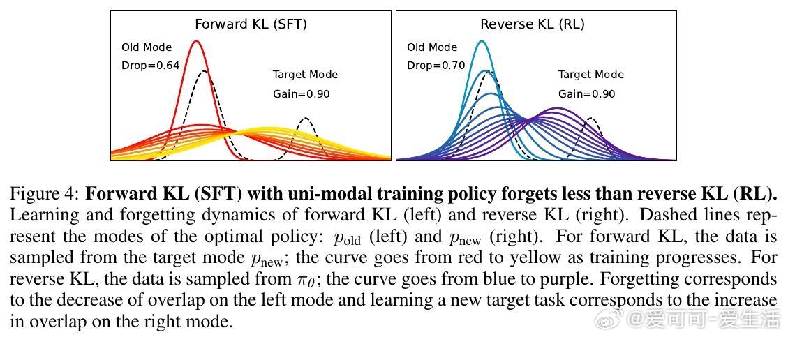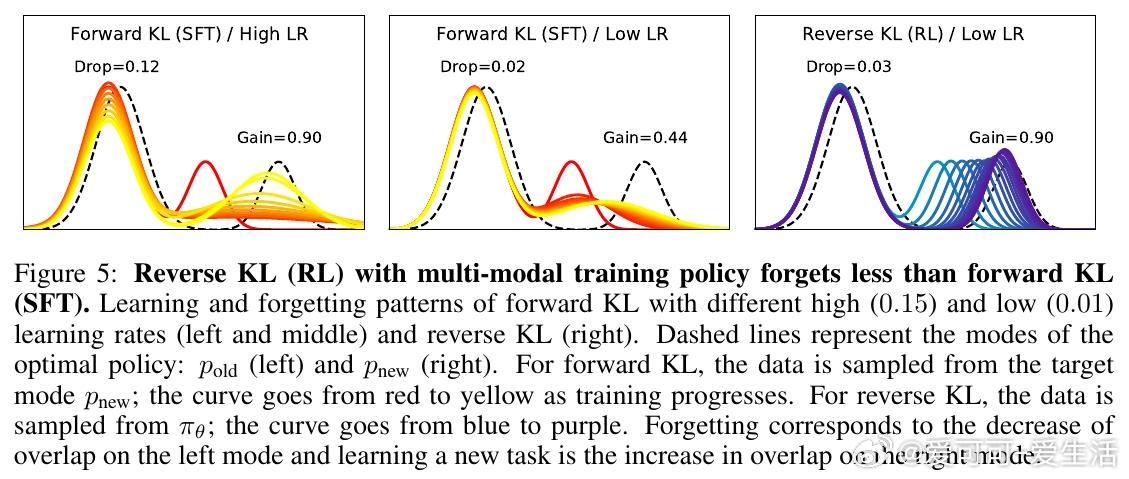 思考:这提供实用指南:在资源有限时,用Iterative-SFT或RL数据后训SFT,即可高效缓解遗忘。长远看,随着代理(agent)持续学习兴起(如Silver & Sutton, 2025),on-policy数据比互联网off-policy更安全,避免不稳定更新。未来理论工作可证明on-policy在TV距离(总变差)下的数学界限。