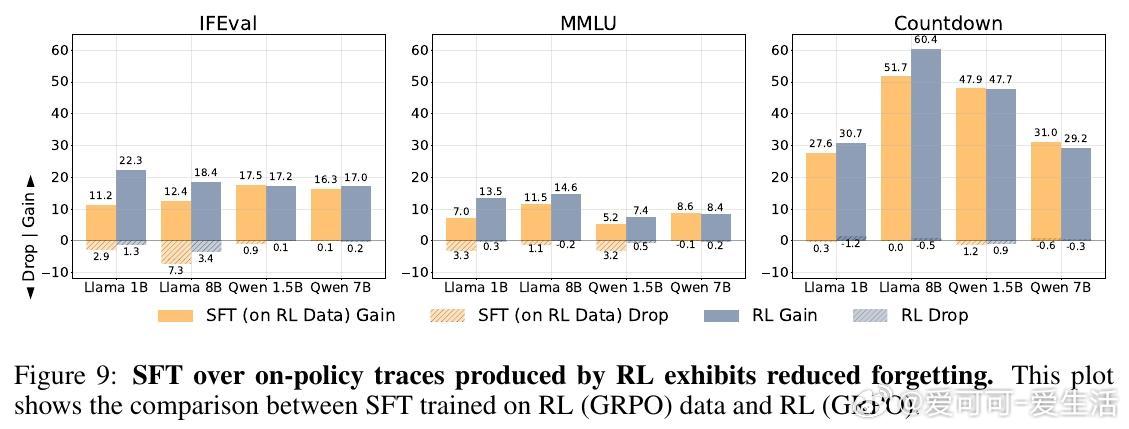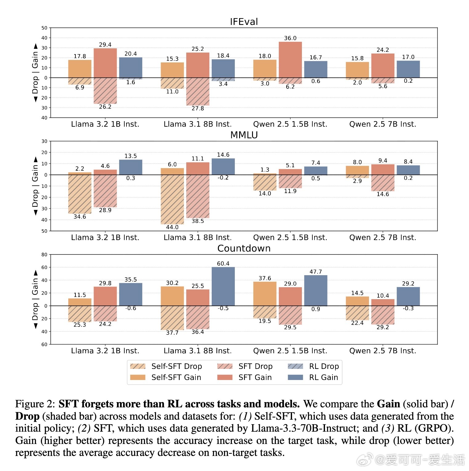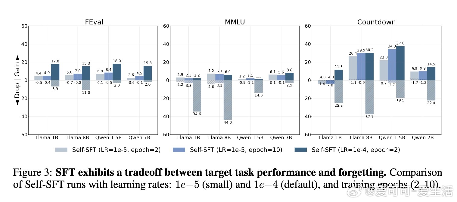 - SFT的痛点:Self-SFT(使用初始模型生成数据)和标准SFT(使用专家模型如Llama-3.3-70B生成)虽能提升目标性能,但往往导致严重遗忘。例如,在IFEval任务上,SFT的gain可达29.4%,但drop高达26.2%;降低学习率可减少遗忘,却牺牲目标性能(即使多训10个epoch也难追平)。