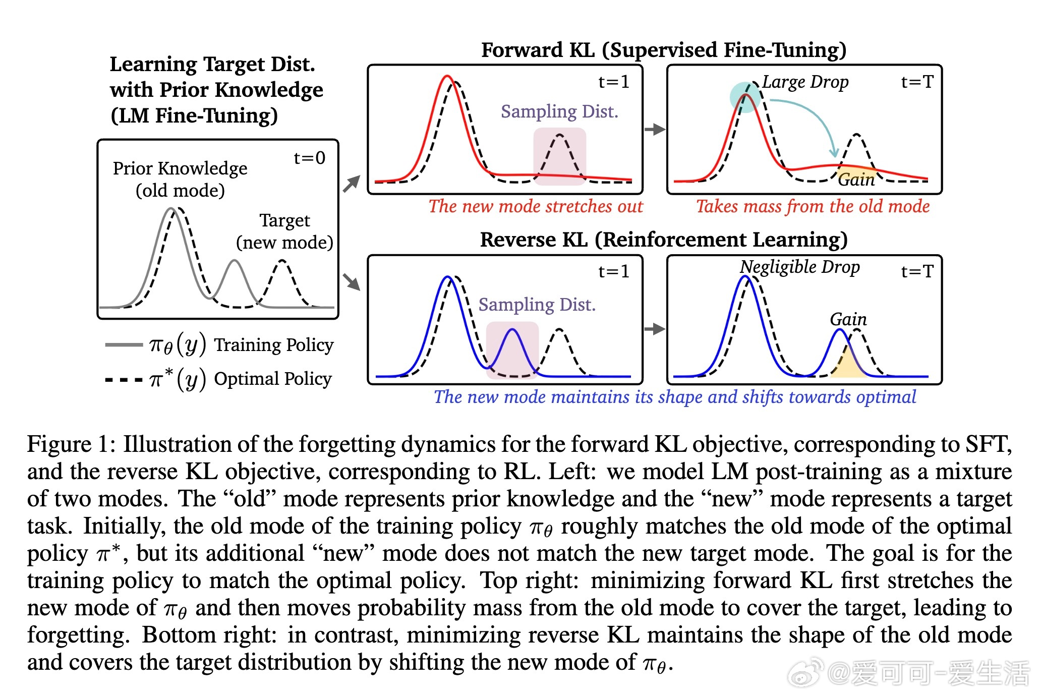 - On-Policy的核心作用:RL每步用当前模型生成数据,确保更新“自洽”。SFT用off-policy数据(固定外部样本),易导致分布偏移。