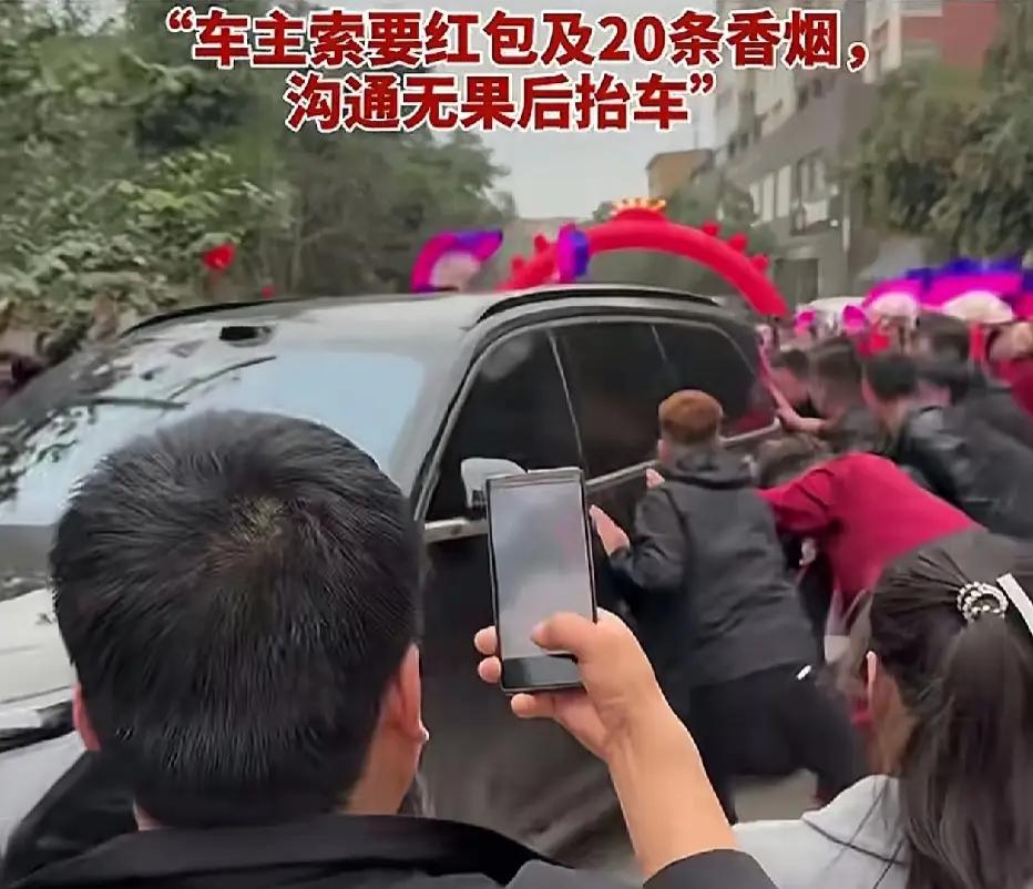 陕西咸阳,婚车在路上行驶,被一辆车挡道,要求新郎给红包外加20条中华烟,否则就别