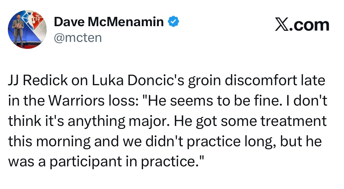 JJ·雷迪克在谈及东契奇于不敌勇士队的比赛末段出现的腹股沟不适时表示: