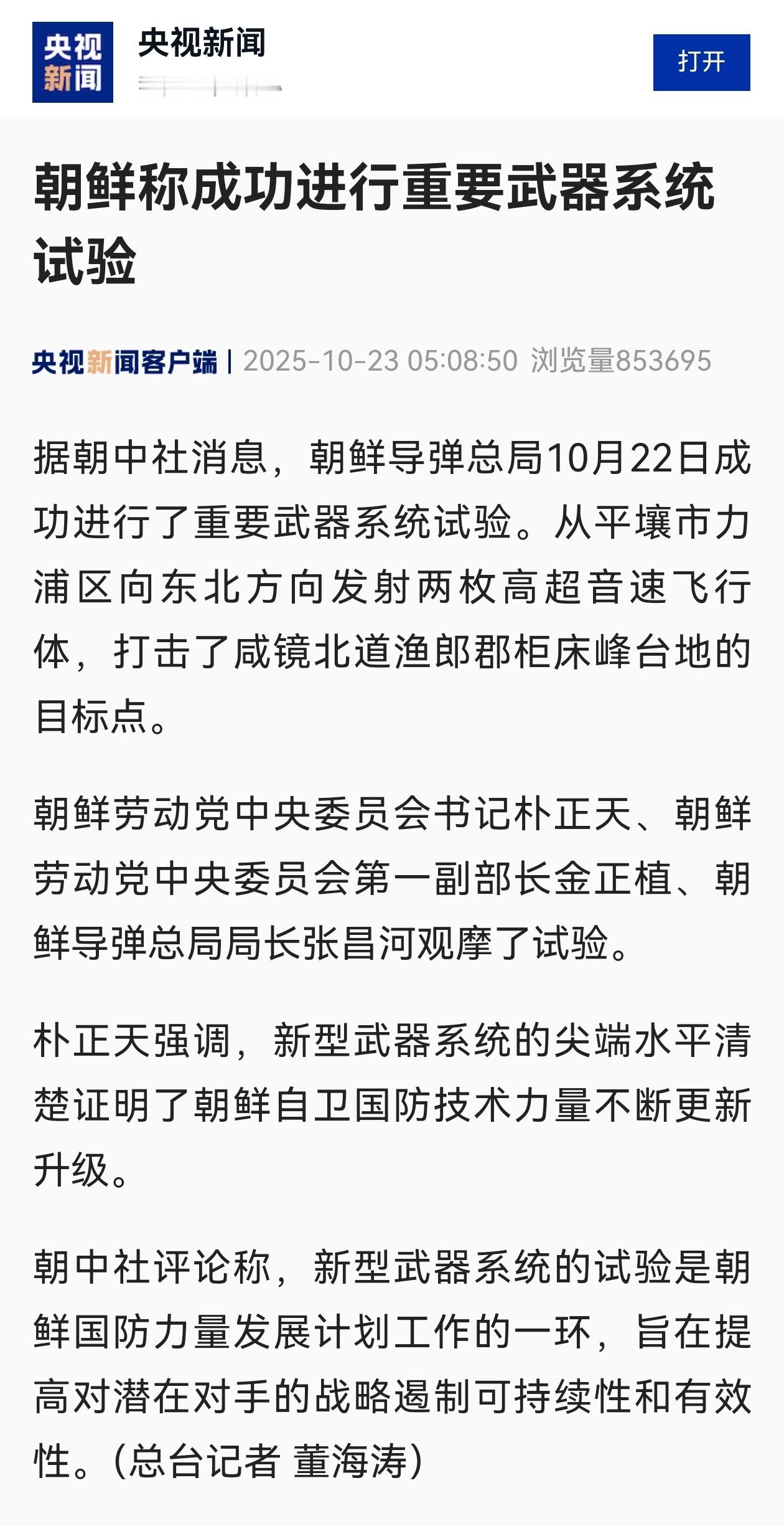 朝鲜试验重要武器系统两枚高超音速飞行体。[笑而不语]