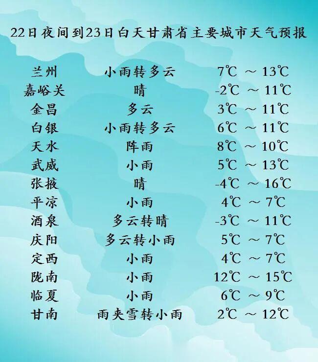 今天夜间到明天白天(10月23日20时-10月24日20时),兰州、白银、甘南、临夏、定西、陇南、天水、平凉、庆阳等市州阴有阵雨(雪)或小雨(雪),其中甘南州西部有中到大雪,陇南、天水、平凉三市局部地方有中雨;武威、金昌、张掖三市多云间阴,部分地方阴有阵雨(雪)或雨夹雪,其中祁连山东部有中到大雪;省内其余地方晴转多云。