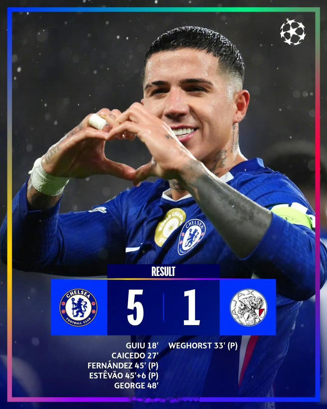 欧冠联赛阶段第3轮,上半场吉乌破门首开纪录,凯塞多进球再下一城,韦霍斯特点射破门扳回一城,恩佐和埃斯特旺相继点射破门。下半场乔治替补建功。