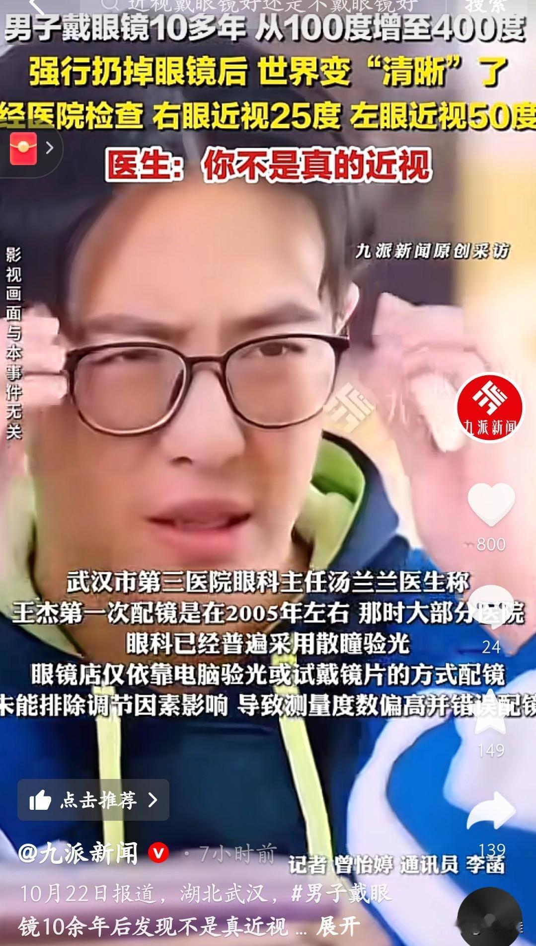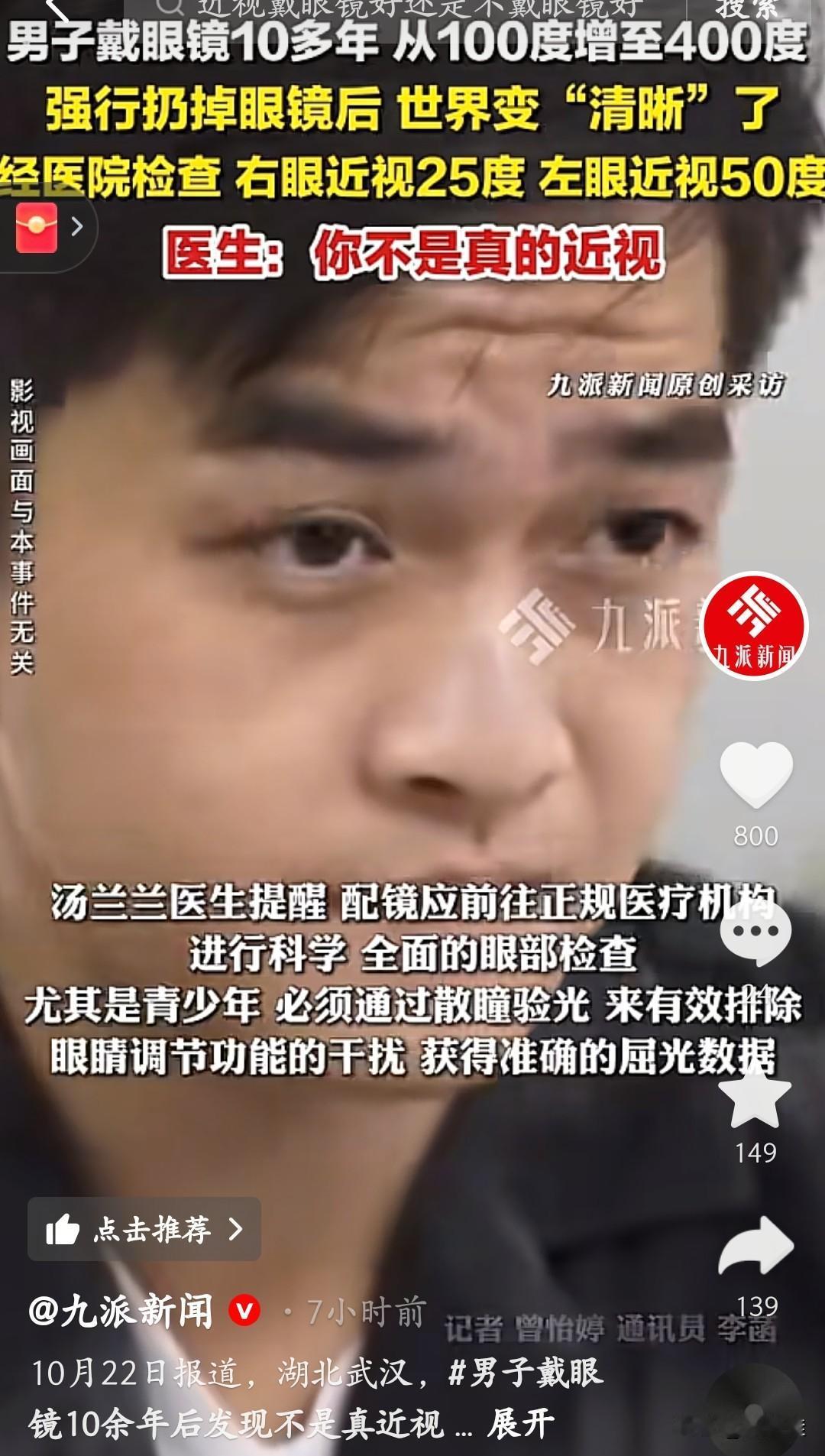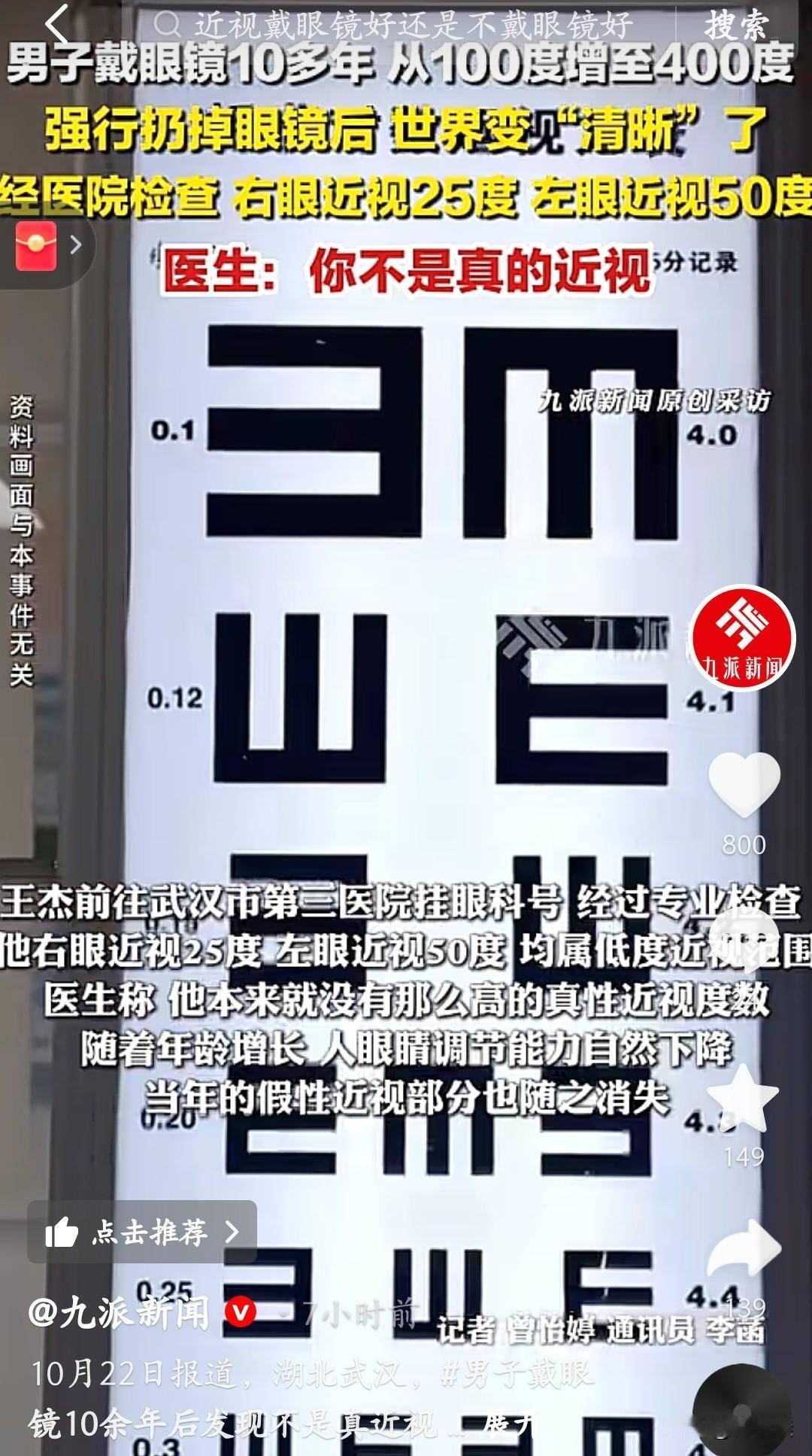 这是假的,绝对是假的!武汉一男子戴10多年眼镜,度数从100飙到400,摘镜后视力反倒变好了?医院一查:右眼25度、左眼50度,根本不是真近视! 原来当年配镜没散瞳,眼镜店电脑验光把“假性近视”算成了真度数。加上年龄增长,眼睛调节力下降,假性部分自己消了。 医生说:配镜得去正规医院!尤其是青少年,必须散瞳验光,不然度数能测高。别再乱戴眼镜啦,先查清楚是真近视还是“假的”!