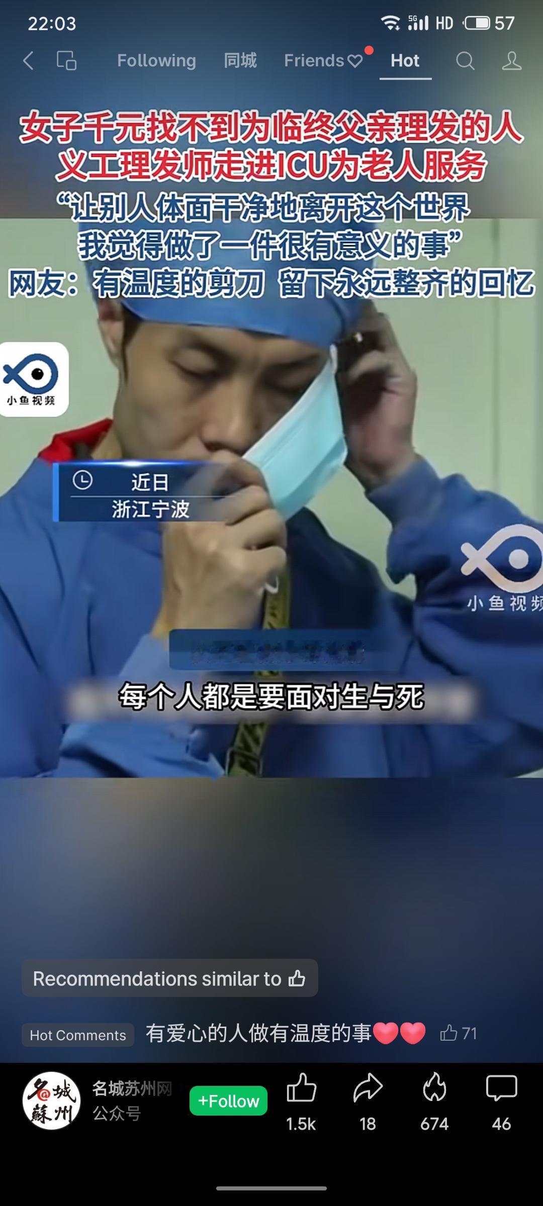一把剪刀的温度:ICU里的生命尊严与人间善意 图片定格了一个关于“告别”的温暖片段。浙江宁波某医院的ICU病房里,义工理发师邱尧清身着蓝衣、戴着口罩,俯身为病床上的老人修剪最后一缕发丝;网友那句“有温度的剪刀,留下永远整齐的回忆”交织成网——这不是刻意编排的戏剧,而是发生在我们身边的生命叙事,用最朴素的方式叩问:当死亡临近,我们该如何守护一个人的尊严?