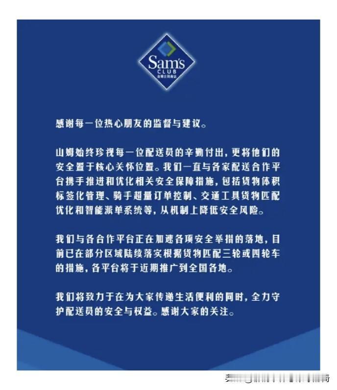 山姆骑手把电瓶车开成“卡车”?热搜炸了后,官方终于说要改了! 上海网友李姐前两天拍的视频直接把山姆送上热搜,评论区两万多人喊“太揪心”。镜头里的山姆骑手骑着电动车,车把挂着两桶5升的油,脚踏板塞着整箱矿泉水,后座堆的洗衣液和大米快有1.8米高,车身歪得像要晃倒,后视镜早被货物遮成了盲区 。 “这哪是送货,分明是拿命赌!”李姐的配文戳中不少人。底下立马有杭州网友晒图呼应,说见过骑手拐弯时货物滑下来,差点砸到路人。更让人气的是,有骑手在评论区倒苦水:“一单才赚几块钱,超时要罚几百,不多装几单根本赚不到钱”。 大家越骂越凶,有人翻出《道路交通安全法》,说电动车载物高度不能超1.5米,这明显违规了,还有人吐槽山姆客服只会甩锅“配送是外包的”。就在热搜挂了两天后,山姆终于回应了,说要给骑手配三轮车、四轮车,现在天津、武汉都已经用上了,很快全国推广。 看到消息的李姐松了口气:“早该这样了!” 有网友已经拍到新配送车,车厢方方正正,能稳稳装下大件货,骑手不用再冒险堆“货山”。不少人评论:“会员费没白交,安全比啥都重要,这波整改必须夸!”山姆商业模式 上海山姆 山姆配送 山姆超市骑手 山姆自提蛋糕 山姆测试 山姆召回