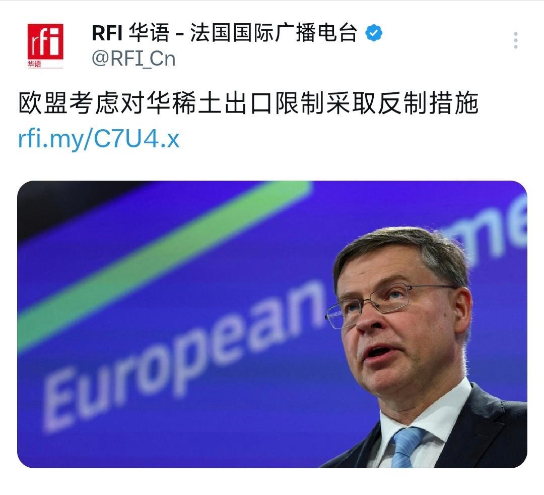 法国国际广播电台今天(10月23日)报道:“欧盟考虑对华稀土出口限制采取反制措施。欧盟委员会正研究对中国近期实施的稀土出口限制采取反制行动,并与七国集团(G7)伙伴协调应对。欧盟负责经济事务的执行副主席东布罗夫斯基斯周三表示,委员会正评估一系列可能的反制选项,以应对中方的新措施。” [机智]评几句:欧盟被美国用关税狠揍时唯唯诺诺,如今倒想对中国稀土反制重拳出击了?中欧之间并不存在地缘政治冲突,本是合作共赢的好伙伴。欧洲企业按规则申请稀土本就畅通无阻,何来"限制"一说?欧盟若真听美国怂恿,非要搞什么反制,最后怕是自食恶果——没了中国稀土,欧洲高端制造业分分钟歇菜。与其当美国马前卒,不如踏踏实实和中方合作,这才是正道。