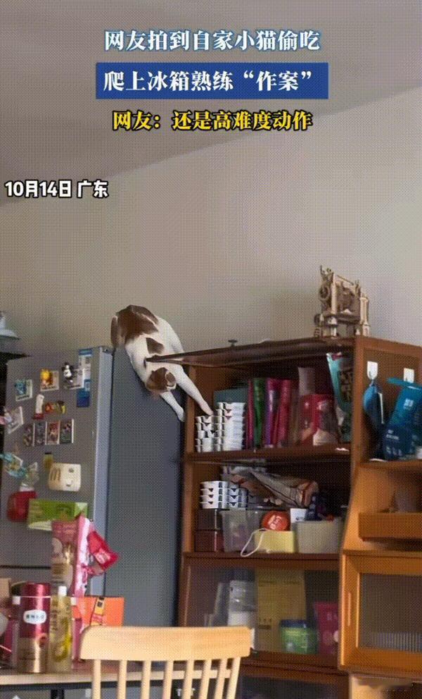 万物皆有灵性!广东,女子偷拍到自家猫咪爬上冰箱熟练作案偷吃,那动作做到了娴熟老练