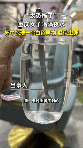想想都恶心! 重庆一女子,晚上睡觉前倒了一杯水没有喝完,杯子没有盖子,第二天端起正准备喝时,突然发现里面有一串白色的虫卵,太恐怖,吓得赶紧倒掉了。网友说,好恶心。 原来,女子的杯子是玻璃水杯,没有盖子,晚上吃剩的水,就放在桌子上没有倒掉,第二天端起来喝时,发现里面有白色的像果冻似的虫卵,幸亏发现了,要不然,喝下去在肚子里繁殖生产,想着都会吐。 没盖子的水杯盛水的话,最好是现倒现喝,如果放置一晚,与空气直接接触,半夜有蚊子,蟑螂什么的频繁出来活动,还有灰尘掉进去,这是常事,还是小心点为好,用有盖子的水杯,确保卫生健康。 从这事告诉我们,杯子要用有盖子的,水最好是现倒现喝。 大家觉得是不是这样? 虫卵问题