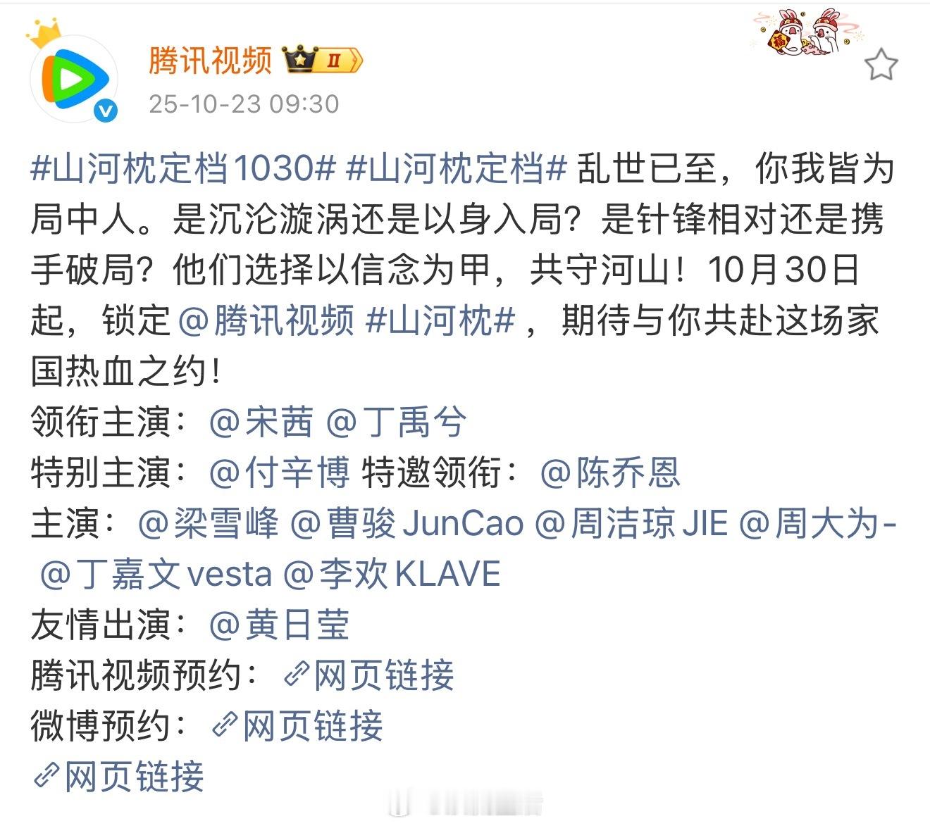 恭喜宋茜、丁禹兮主演的山河枕定档10月30号,身逢乱世,英雄辈出。一起来追剧