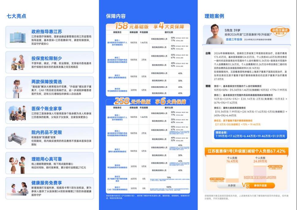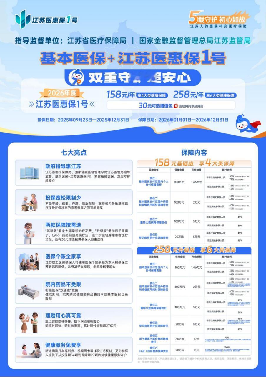 家里有老人、小孩,作为顶梁柱的我总在担心医疗保障的事儿。直到了解了江苏医惠保 1 号,这几年它给我们家的守护特别实在,今天就跟大家聊聊真实感受。 先说说家里老人的情况。爸妈年纪大了,难免有些基础病,之前想给他们买商业保险,要么因为年龄被拒,要么因为病史保费超高。但江苏医惠保 1 号完全没这些限制,不管多大年纪、有没有既往病史,只要有江苏基本医保就能参保。去年爸爸住院,用到了一些不在医保目录里的药,本来还担心费用问题,结果江苏医惠保 1 号能报销,大大减轻了负担。而且它还有 34 项投保期健康服务和 27 项保障期健康服务,像定期体检咨询这些,对老人特别实用。 再看孩子这边。小朋友抵抗力弱,头疼脑热是常事,万一遇到大病,治疗费用就是大难题。江苏医惠保 1 号有 “基础版” 和 “升级版” 可选,“升级版” 还包含了质子重离子、CAR-T 药品这些前沿高端疗法,要是真遇到严重情况,也能有更全面的保障。更方便的是,我作为职工医保参保人,能用自己的医保个账余额给孩子投保,不用额外掏钱,全家参保都省心。 作为家里的顶梁柱,我最看重的就是理赔效率和稳定性。江苏医惠保 1 号是在省医保局和江苏监管局指导监督下的,还有 9 家保险公司共同承保,让人很放心。之前帮亲戚办理过一次理赔,线上就能操作,响应快,赔付也及时。而且它累计赔付金额已经超 27 亿元,这么多年下来,服务一直很稳定。今年还新增了滴滴打车福利券、视频周卡等 11 项生活权益,参保之后不仅有医疗保障,还能享受这些生活福利,特别贴心。 这五年,江苏医惠保 1 号就像一个 “健康卫士”,不管是老人的医疗顾虑,还是孩子的保障需求,或是我们顶梁柱对稳定保障的期待,它都能一一回应。如果你也在为家人的医疗保障操心,不妨多了解下,或许能解决你的不少烦恼。
