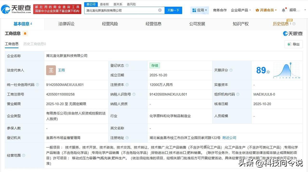 【湖北宜化成立新宜科技公司注册资本1.2亿】 天眼查App显示,近日,湖北宜化