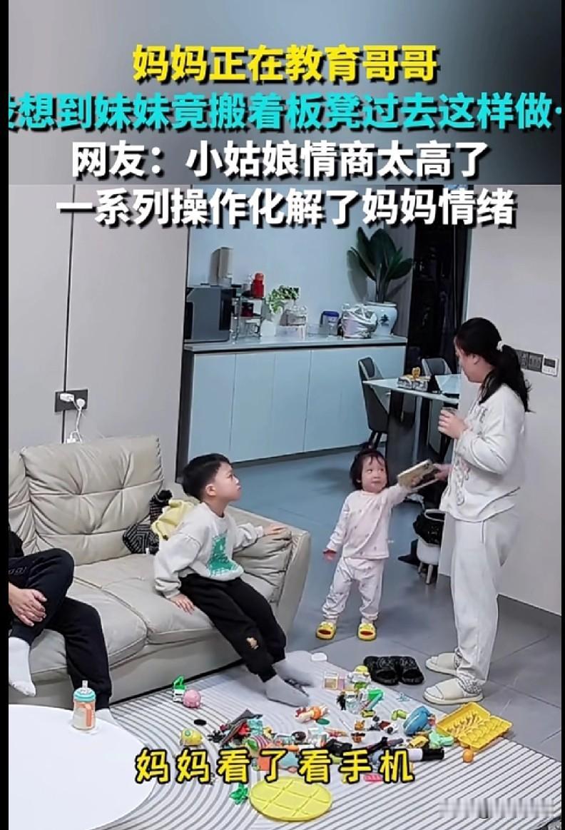 家人们快来看这个神仙妹妹!妈妈正在教育哥哥,小家伙居然搬着板凳就过去了,一系列操作把我看呆了! 妈妈本来气得不行,妹妹颠颠儿地把板凳塞给妈妈,还仰着小脸各种撒娇卖萌。妈妈一看手机,情绪居然就这么被化解了! 网友们都惊呼:这小姑娘情商也太高了吧!简直是家庭氛围的“调和剂”。咱就是说,这波操作属实给全家上了一课,原来哄人还能这么有技巧!有这么个小棉袄在,家里的小摩擦根本不算事儿~