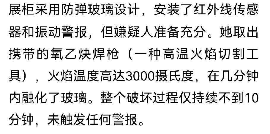 还记得1999年最火的电影大片《偷天陷阱》吗?肖恩康纳利和美艳绝伦的凯瑟琳泽塔琼斯进出博物馆如入无人之境,什么珍贵的物件都跟自己家的一样。 咱们也有了自己的凯瑟琳泽塔琼斯。就在今天,巴黎警局宣布,一名24岁的中国女子涉嫌偷盗巴黎自然历史博物馆的天然金被起诉。 狗头金,听说过没有?就是自然产生的金块,有大有小。巴黎博物馆这块很大,非常大,足足有5公斤之重,被这位伪装成清洁工的东方凯瑟琳用乙炔枪简简单单地就弄走了。24岁的东凯总共到手好几块共6公斤狗头金,按八成的含金量至少有五公斤纯金,市价超五百万(好像也不多嘛),但这是天然金,恐怕比纯金值钱的多。 据说东凯是把狗头金塞包里准备从西班牙回上海时被查获的,有点疑惑:就算是组团出来干项目,西班牙离境和浦东入境带五公斤黄金能不出事?跟肖恩康纳利和泽塔琼斯不一个层级啊?[我想静静]