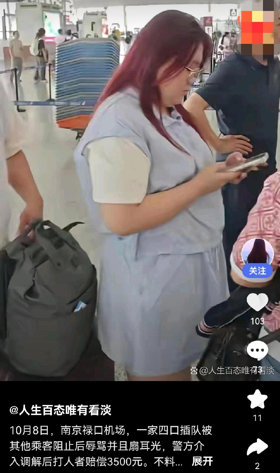 长假期间,交通拥堵人头汹涌,确实容易上火,这都能理解,都是普通人嘛,没啥特权就别闹腾。长假最后一天,这一家四口普通人在南京禄口机场就整出了特权的气势,先是插队被怼,然后胖姐姐就动手打人,据说是好几个“大比兜”,然后帽子叔叔来了又装弱势卖惨,说是老父亲重病全家心情不好,承认错误愿意调解但是请事主删掉视频。然鹅,视频删除后这家人又有恃无恐了,该吵吵该骂骂。万万没想到啊!事主居然把视频又恢复了! 其实我不能理解的是,高铁尤其是飞机,为什么要挤要插队?上面都有大座(郭德纲的包袱)不用站着,就算行李架满了交给空姐就行,插队有多大意义??