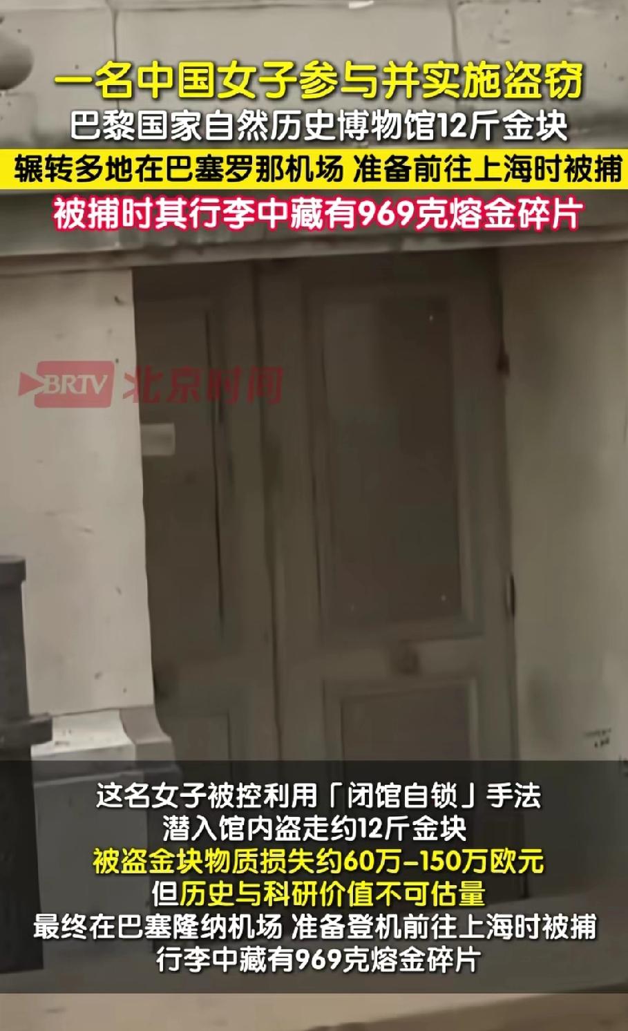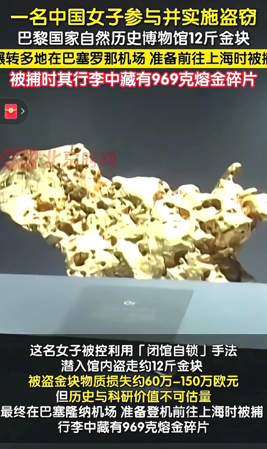 最新消息,10月21日,法国警方逮捕了一名24岁的中国籍女子,她参与并实施了盗窃巴黎国家自然历史博物馆12斤金块的犯罪行为。该女子在巴塞罗那机场准备前往上海时被捕,被捕时其行李中藏有969克融金碎片。 被盗金块价值在60万至150万欧元之间。这名女子可能面临15年监禁。 说明这个博物馆展览品是真金子,下次记着千万不能放真金子啊,放模型就可以了。