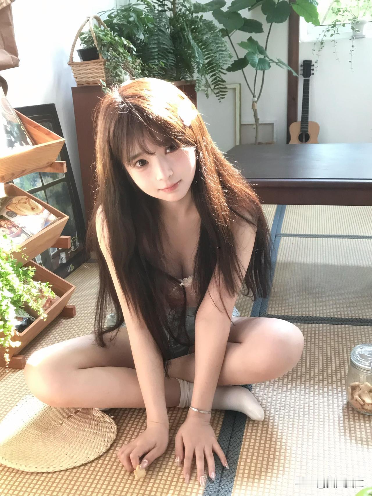 阳光洒进房间,少女与绿植相伴,清新自然。