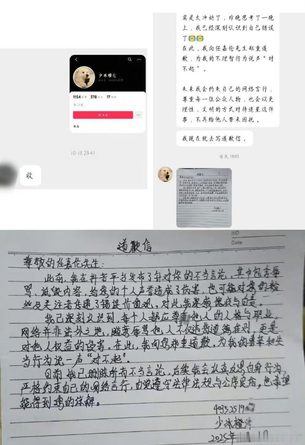 任嘉伦粉丝收到王俊凯家那么多道歉信???看这字体[并不简单]但凡多读点书也不至于