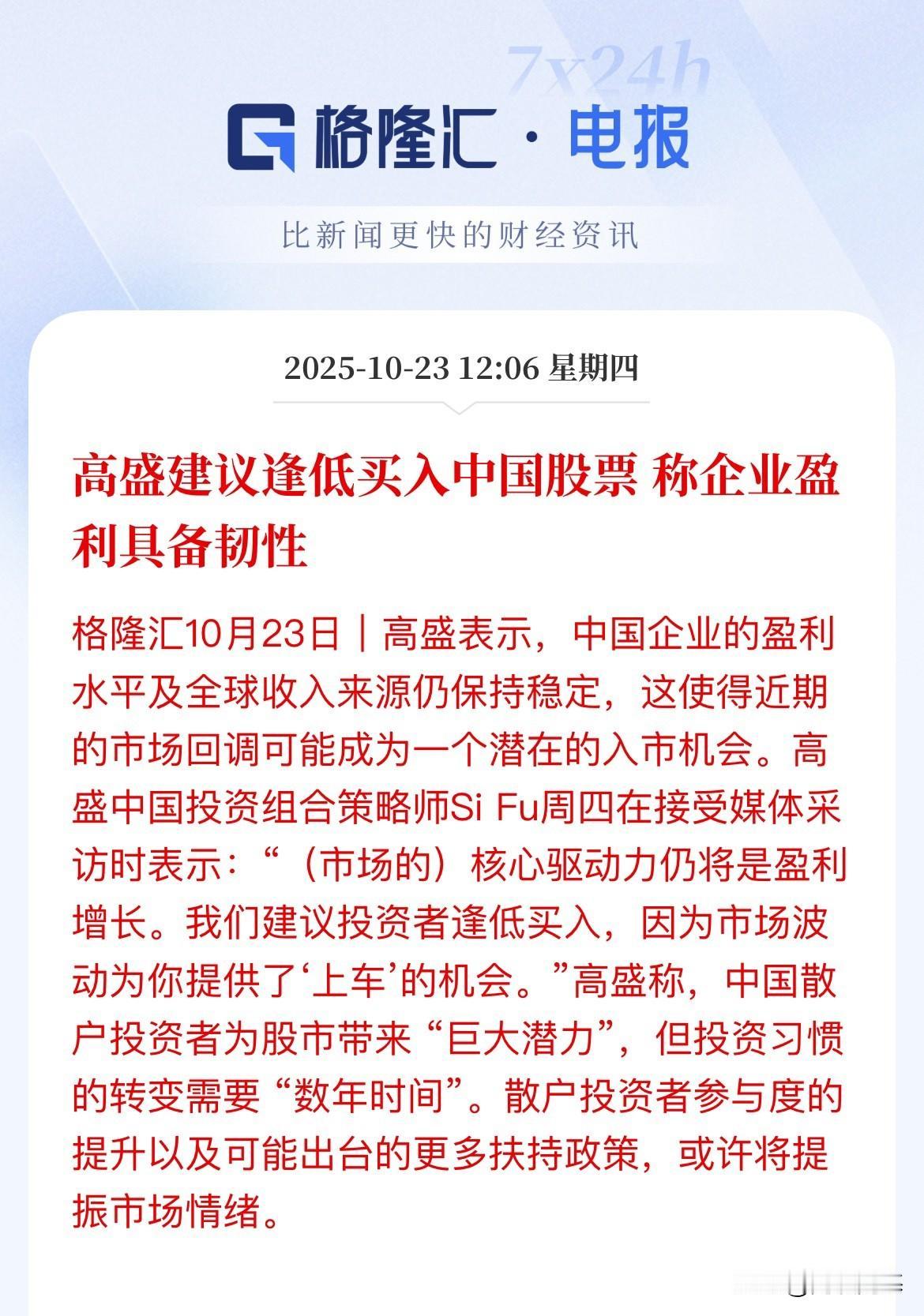 “倒车接人”,回调就是机会,这可不是我说,是高盛说的,当前的市场的回撤也许是一个潜在的入市机会 高盛夸,中国散户为股市带来了“巨大的潜力”,是不是没想到自己威力这么大,毕竟2亿股民那不是吹的, 记住人家只是建议,不是“保熟”的,具体还是冷静一点。