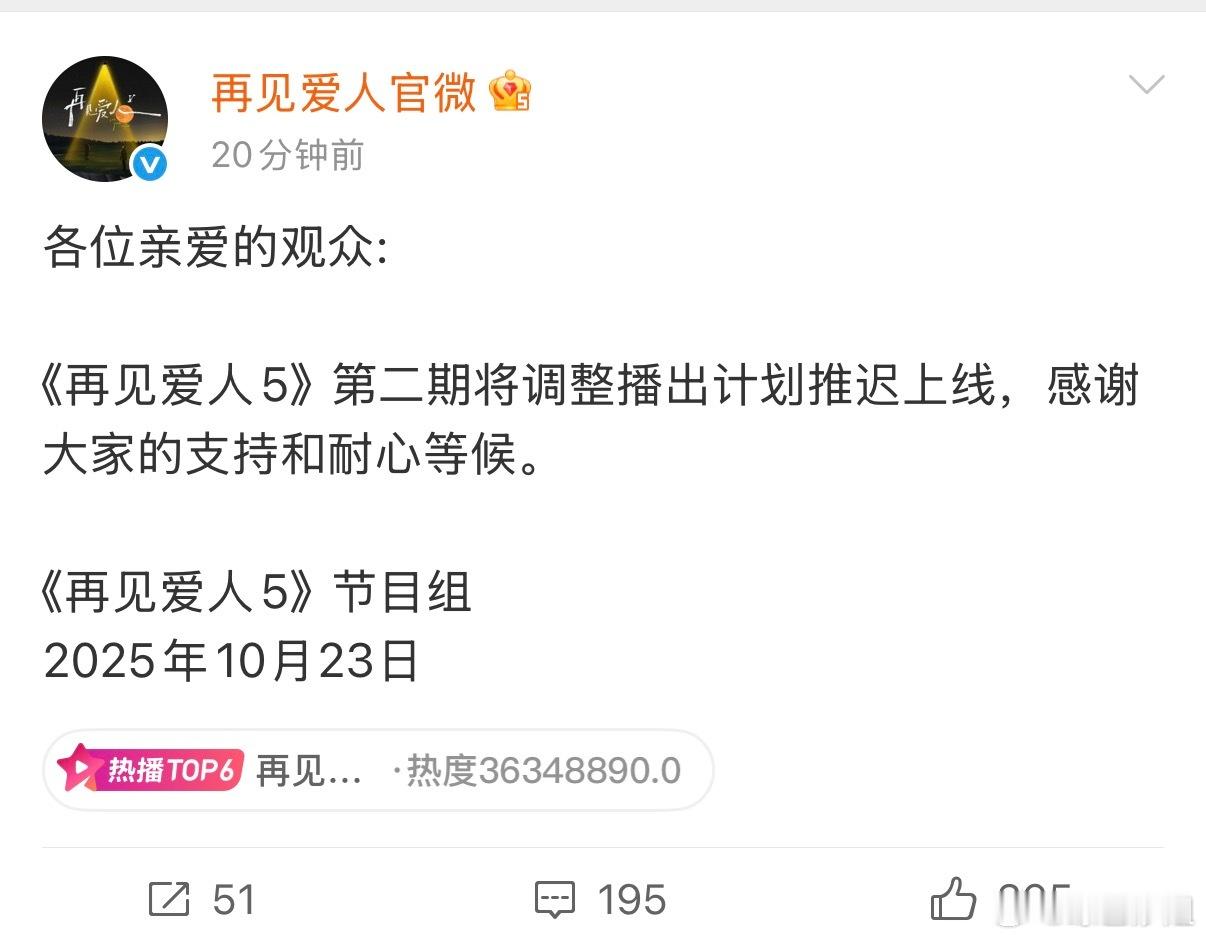 《再见爱人5》没更新哇,官博称第二期将调整播出计划推迟上线~再见爱人没更新