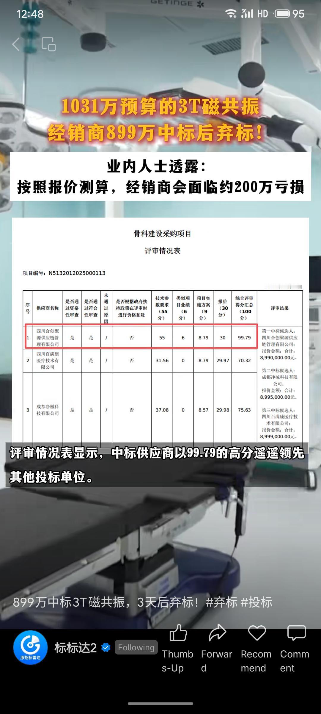 马尔康市人民医院预算1031万元采购3T磁共振,设最高限价900万元。一经销商以899万元中标,但中标后迅速弃标。据业内测算,此报价可能导致约200万元亏损。采购方依法废标,将重新招标。