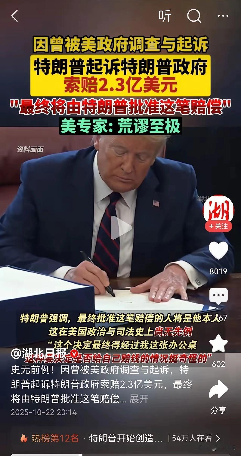 特朗普状告特朗普政府索赔2.3亿美金,如果政府支持特朗普的诉求,那么将由特朗普批准,由特朗普政府赔偿特朗普2.3亿。这应该是史上最荒谬的诉讼了。这就好比公司老总以个人的名义把自己公司告了,要求自己的公司向自己赔偿损失。这是名正言顺的中饱私囊,牺牲公家利益,来满足个人的私欲。特朗普应该是世界上最有想法的国家元首,没有哪个国家元首能够有如此的操作模式,自己把自己领导的政府告了。