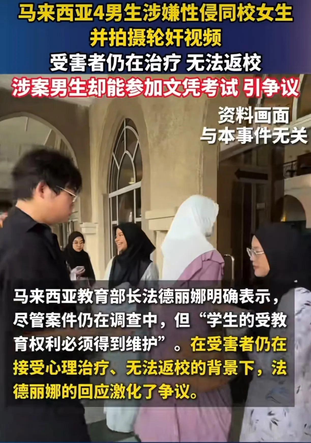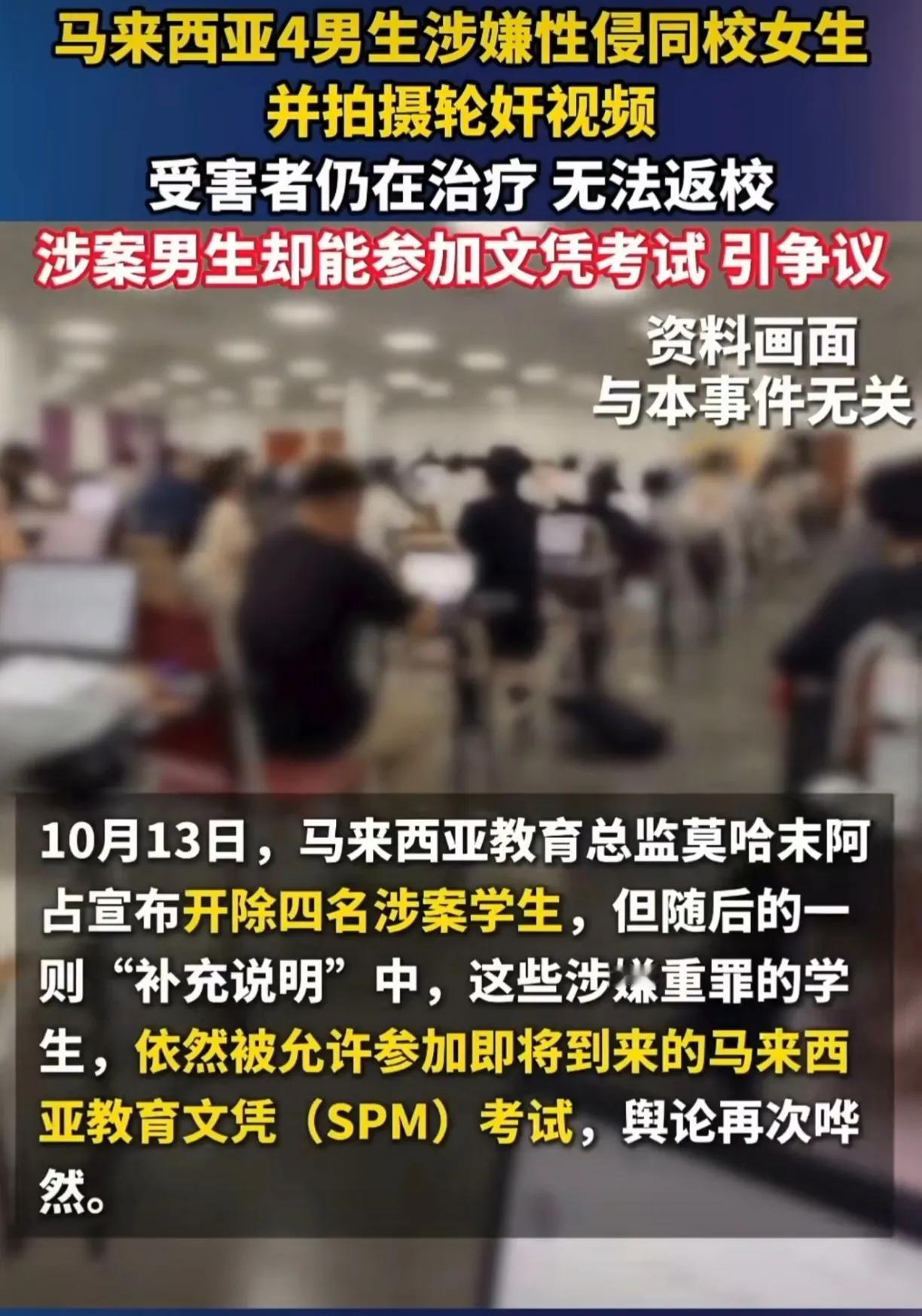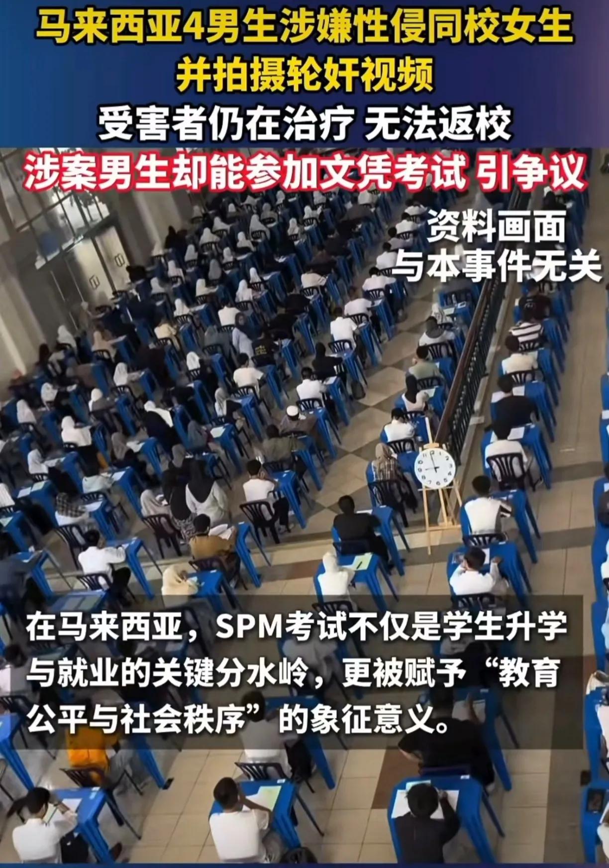 马六甲校园这事真让人头皮发麻! 一名16岁的女生进教室拿作业,被4名17岁的学长拦住,随后女生被拖进教室轮奸。期间4个男生还拍摄视频传着玩,视频流出后,学校选择将这4名男生开除。但教育部表示,这4个男生仍有资格参加后续教育文凭考试。 女生现在还躺在医院做心理治疗,这几名施暴者牢都还没坐,竟还考试升学! 有网友说: 这不算什么,我认识的一个女生被她班的男同学轮奸,而那些男生还继续上了大学,现在许多还混的不错。 在学校出的事,学校应该把犯人控制住,然后报警,交由警方处理。而不是简简单单的开除,就能了事。 不要急,要等子弹飞一会,看马来西亚最终宣判校园霸凌致人死亡的6人全部死刑,正义也许会来的。 普通人平安的渡过一生,真难啊!以前听这话觉得像个玩笑,现在看来自己的认知还是太肤浅了。