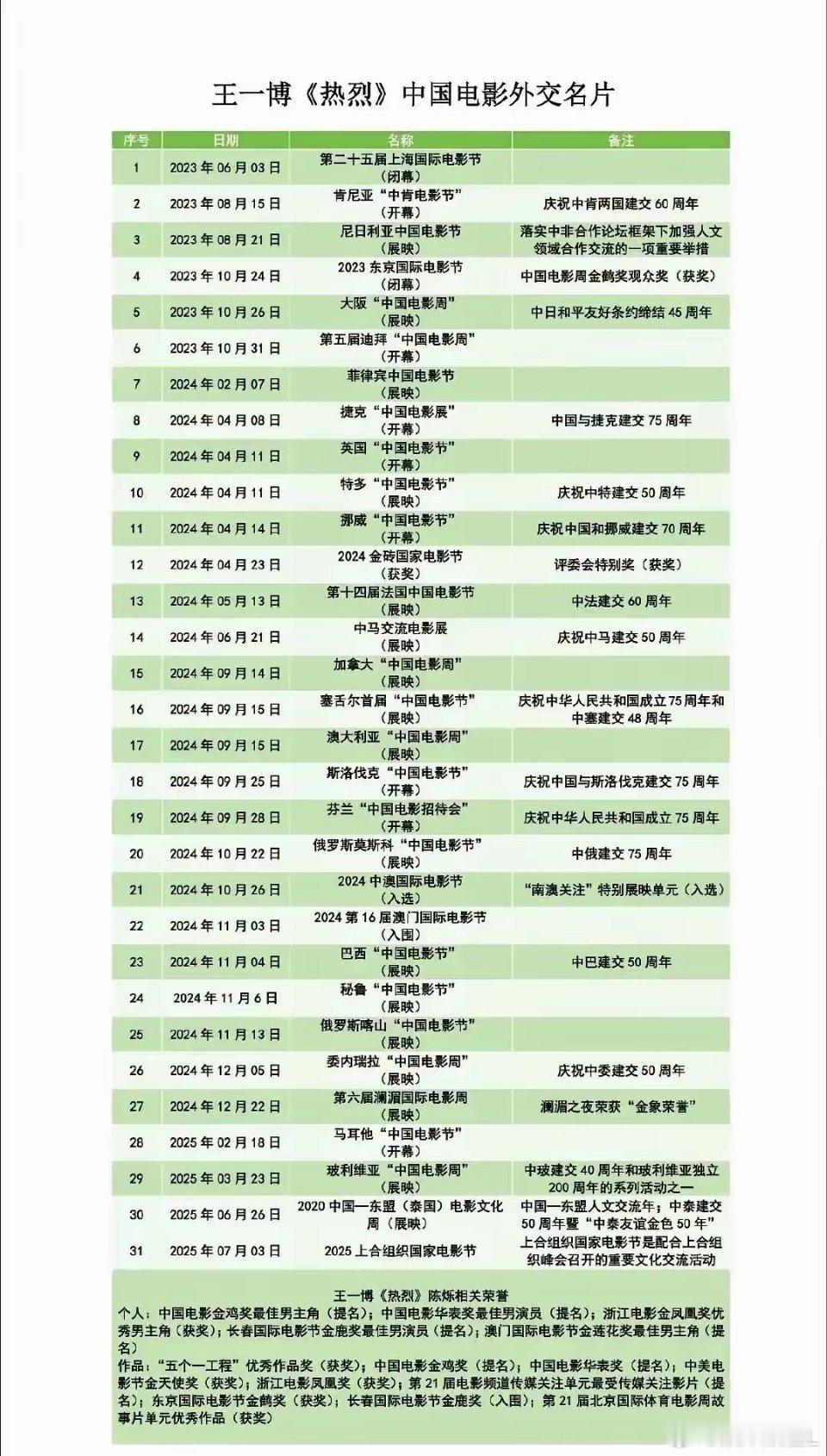 中国电影出海“遍地开花”,王一博三部电影持续发力。央视新闻数据显示,2025年前三季度,我国在全球30多个国家和地区落地31个电影节(展),而王一博的《长空之王》《无名》《热烈》不仅占据三席,更多次高频展映。其中《热烈》自2023年上映以来,累计出海展映超30次,仅今年海外展映就至少6次,热度超过多数新片。